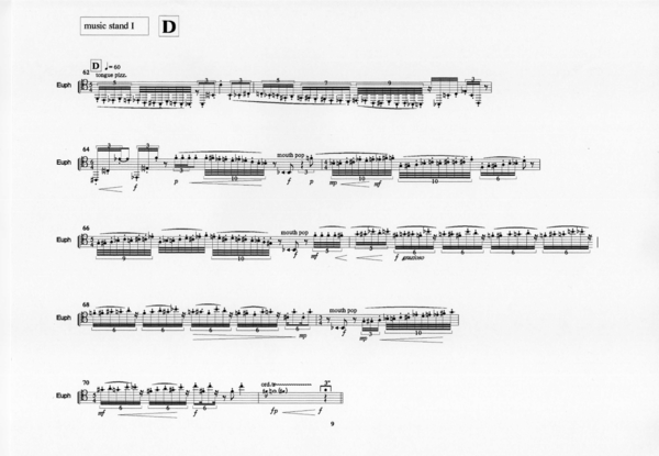 The works were created as collaborative explorations of new and unconventional musical means and contained several features that served to expand the field of solo music for brass instruments. What is possible? was a common question from the composers. Instead of using traditional limits to answer the question, Davidsen asked the same question of himself as an artist: What can be done on my instrument? Challenging the limits, creating new challenges and adding tools, such as electronics and percussion, to the musical expressions, Davidsen’s concerts illuminated the euphonium as a medium for contemporary music. The compositions in the project are different and challenging, but are still in creative dialogue with the canon of music for the instrument. In the search for creative solutions to the making of new sounds and techniques, written and spoken dialogue with the composers was essential in the project, including in the wiki database that contains sound and notations of extended playing techniques. To illustrate the artistic research practice, a description of some of the works will be presented below.