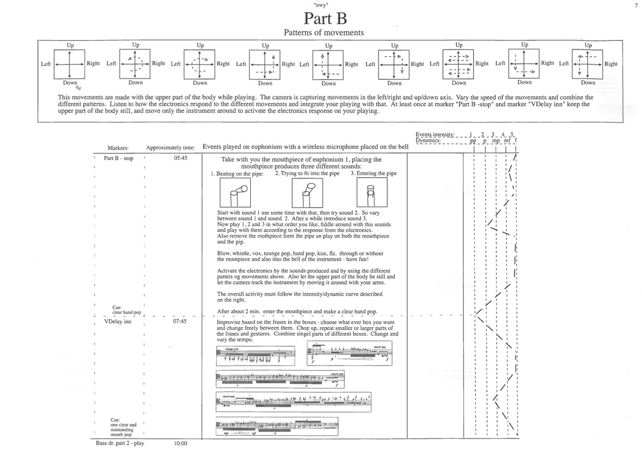 Nwy by Karsten Brustad is a work for euphonium and electronics with motion tracking. The piece was the third work in an Egypt-inspired trilogy, and the title, Nwy, refers to an Egyptian word for water as the creator of life. This piece contains no traditional euphonium sounds; all sounds are manipulated through different playing techniques (mouthpops, air sounds, toungeslaps, etc.), electronic manipulations, grand cassa (bass drum), and combinations of these. The dialogic features of this collaboration will be addressed in the third part of this exposition.