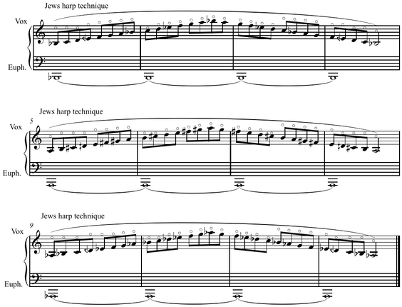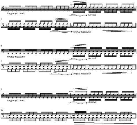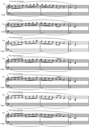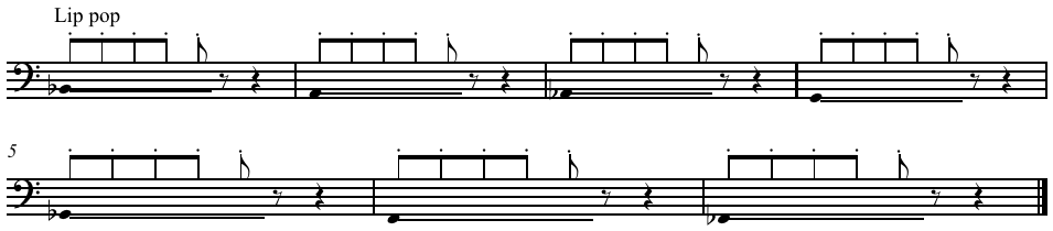 Involved playing techniques: - Lip-pop - Singpop - Soft tongueslap - Hard tongueslap - Air sounds - Air lip-pop - Handpop - Mouthpop - Tongue pizzicato |