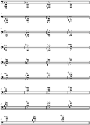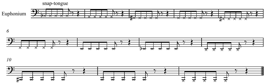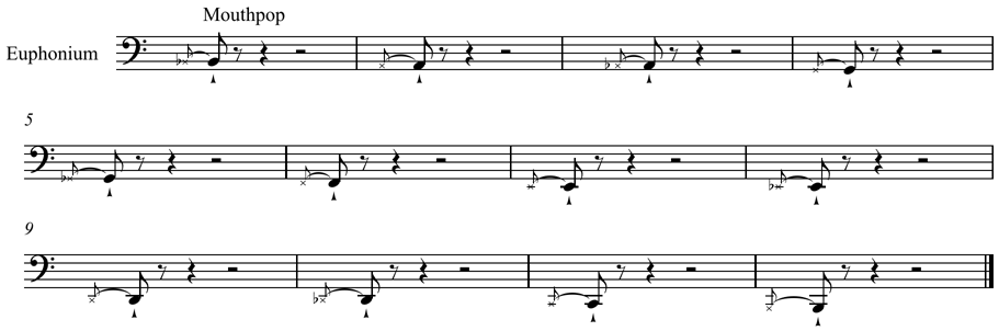 In this piece there was no use of ‘normal’ euphonium sounds. Each tone was expanded with an acoustic playing technique, electronics, bass drum, or combinations of these. Many of the musical sequences needed very close collaboration with the technician, who in this case was Brustad himself. For this reason, the performance is best described as chamber music.