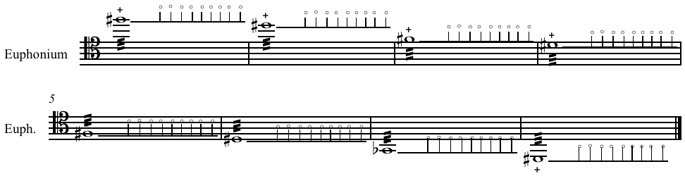 Brustad was interested in using acoustic instruments in live interaction with electronics and in several ways blurring the distinctions between the acoustic and electronic. Two out of three pieces he wrote for Davidsen made use of real-time electronic processing. The composer also had a great interest in, and eventually an insightful understanding of, the use and notation of new playing techniques for euphonium. There were a number of meetings where composer and artist brought ideas and propositions to the table and explored them together. The learning processes were mutual, and they both developed insight in their own and each other’s artistic fields.