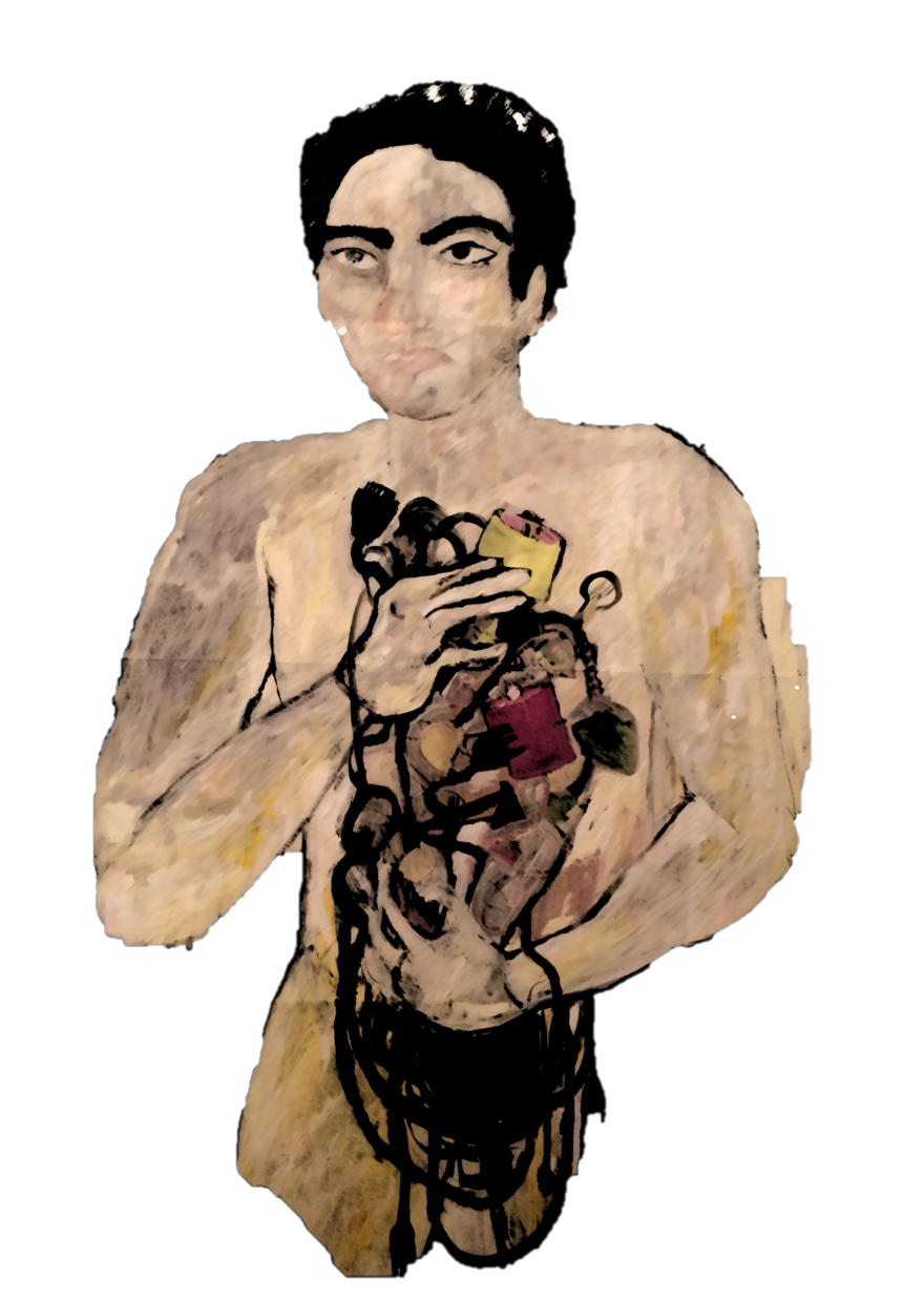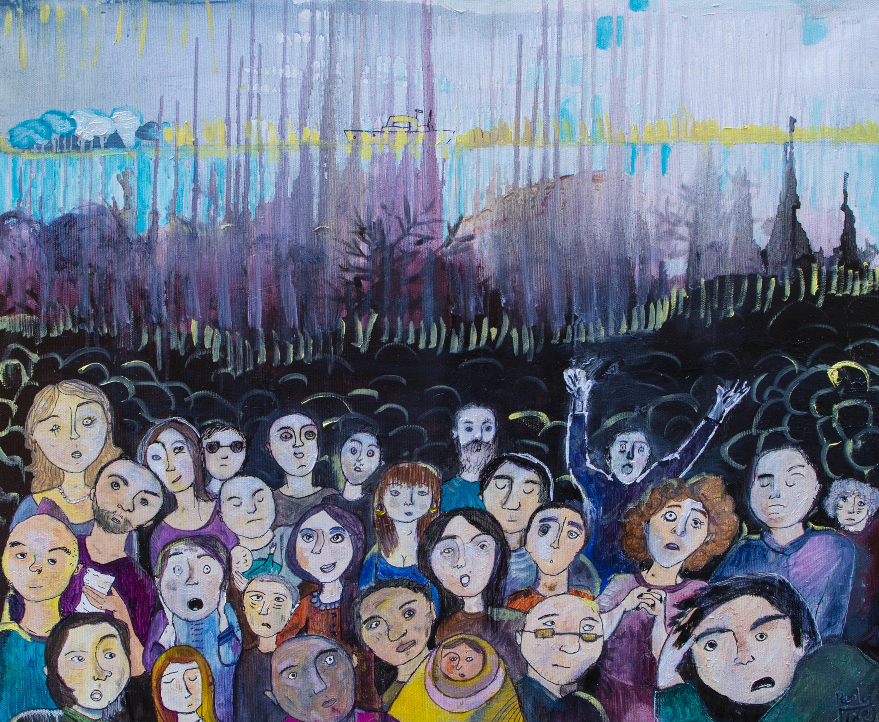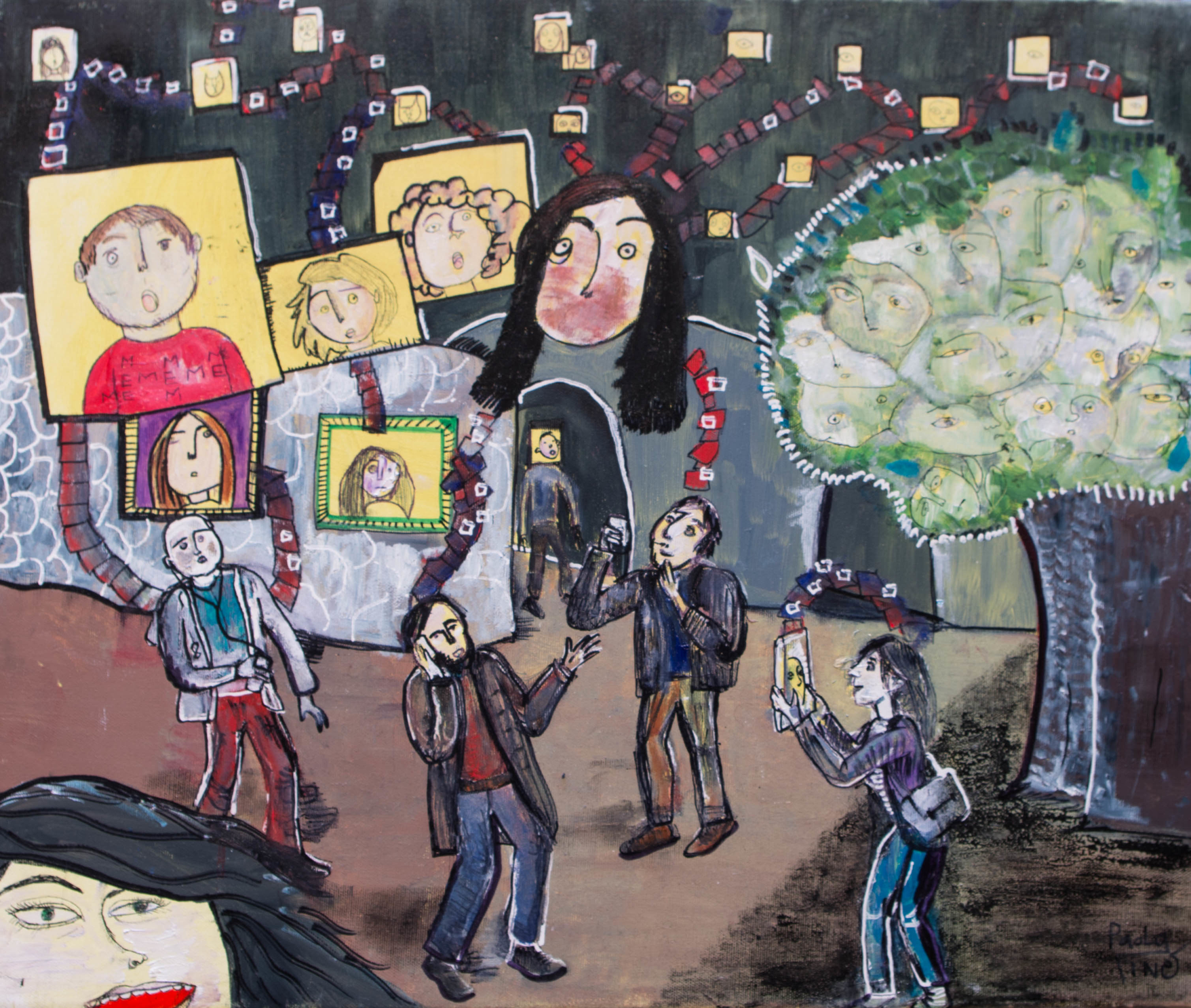 In ‘Shop of the Heads’ and ‘Virtual Relations’ I explore city behaviours in more depth. The former is a dystopian representation, purposefully provocative, that portrays a scene in which people can literally replace their heads in order to appear and think like each other. Through this means, I attempt to describe the absurdity by which many people avoid critical thinking, preferring to take up as their own the opinions imparted on them through media or personal social relations. While people often express their desire to reinforce their own individuality, I have observed that it is rare for people to go against the majority, particularly if this opens them up to criticism. Alternatively, ‘Virtual Relations’ touches upon the emergence of virtual relations, through which superficiality takes precedence and real-life interactions become a thing to avoid. The pictorial representations here both sum up my findings but also provoke emotions in the reader. 'Grow Up in the Crowd' expands further on the concepts explored so far. It shows a child in the lower areas of the painting, walking amongst tall adults. The crowd consists of presences and absences, of unknown people and problems. This painting attempts to portray the realisation of the uncertainty of one’s place in the world. The child in the crowd is a reflection on the loneliness of people and on the potential of children. The paintings are all linked to one another and all the topics have been interweaved in order to reinforce each other.