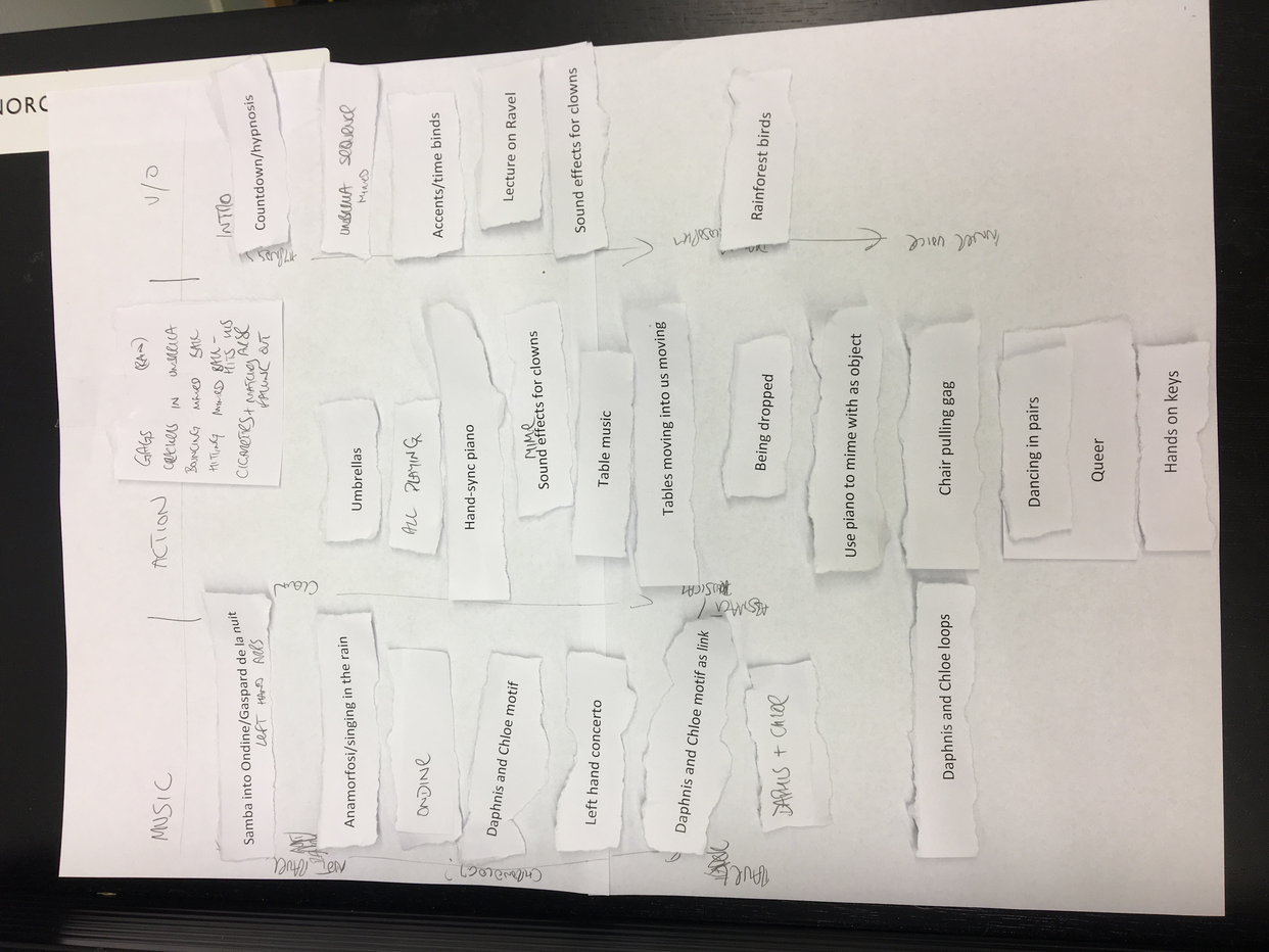 When we got into the room together, Zubin and I were immediately reminded of Anamorfosi by Sciarinno, a brief piano piece from ? that mashes-up Singin in the Rain and j'eau de l'ea to great effect. It seemed possible for us to wield this piece and put it into the mix of Ravel music. To insert a piece into another piece.