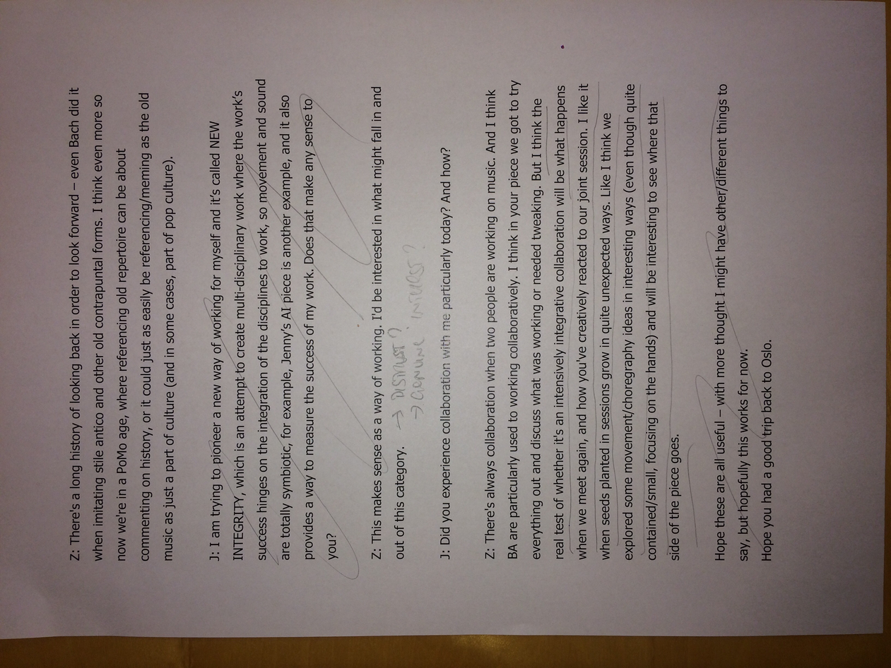 The rather surprising upshot of this process of collaboration between not just myself and Zubin Kanga but also Bastard Assignments, is that I need to compose the material more and hammer things down. This means choreographing, notating, and making decisions by myself. Sadly this is because of time contraints and practical issues. It would be easy to not include this project within my research but I find its inclusion interesting because it became clear that more was required of me. My taking the lead as composer and decision-maker is a result of collaboration and conversation.