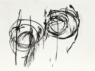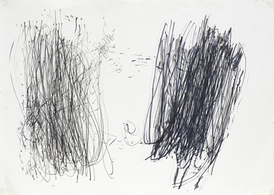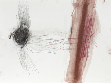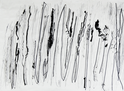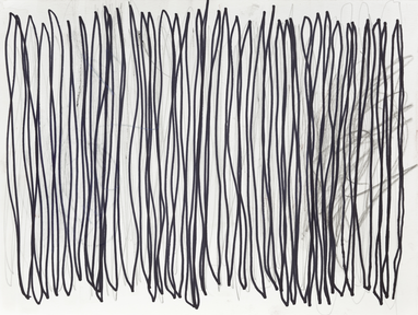 At the outset of this project, which has been documented on video, and sometimes only on audio, I drew on small watercolor pads, or 60 x 85 cm. sheets of drawing paper. I sat or stood, and was sometimes amplified (with two Korg clip contact mics that could hold my drawing tools), and sometimes not. I developed rules for the practice. When drawing with my left and dominant hand, I closed my eyes or looked away and tried to concentrate on my movement as I listened as acutely as possible: noting how my gestural actions related to the sound of the amplified drawing tool, as well as the response from my software instrument, which, as always, could not be fully predicted; often my instrument's sounds manifested as sudden and unexpected eruptions of electronic feedback. When drawing with my right hand—with which I had little control—I allowed myself to look at the page. Sometimes I drew with both hands. In this case, my rules dictated that I could look at my right hand, but not my left hand, as the latter possesses the ability to create a more visually considered result, which was not the focus on this research. When making ambidextrous drawings, in which I aimed to focus on linear or curvilinear gestures, I strove to move my hands in contrary motion, noting that this resulted for me in a kinaesthetic or entrained sensation or affect, again shifting my attention away from the visual result. Later, I introduced greater difficulty into the process by taping together 5-8 different drawing utensils, attaching them to the clip mics, and then grasping them in my fists. This ensured that drawing with skill would be an impossibility. I was trying to get to something else, beyond mastery.