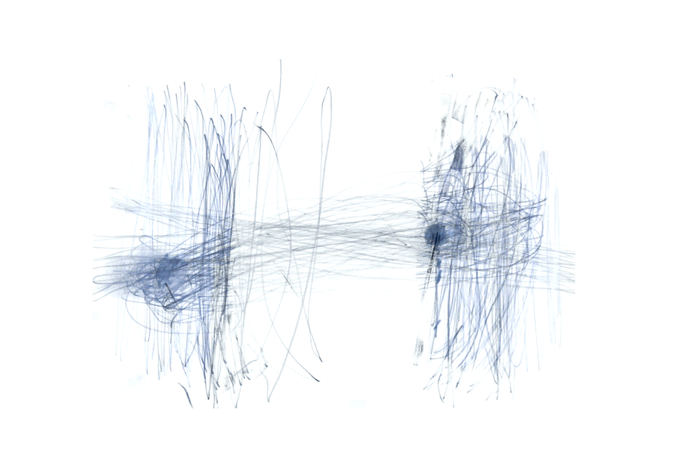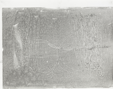 Soon I wished to expand the scale of the drawings, so I placed a piece of paper on the floor that corresponded to my height and "wingspan" when my arms are laterally outstretched. As a potential drawing surface, the paper's relatively large area intimidated me. I walked around it for at least a week without doing anything with it. Eventually, I began lying down on it, exploring the paper with my body as both a sounding surface and sounding space: crawling or rolling across it, while amplifying the paper with contact microphones. After a few days of exploration, I created what for me was a much larger ambidextrous drawing, while doing my best to abide by the rules that I had set for the smaller drawings.