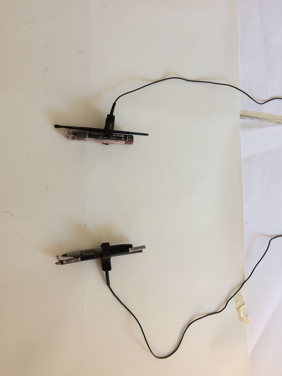 Kneeling two-fisted (four on the floor), with contact microphones attached to pencils grasped in the left and right hand.