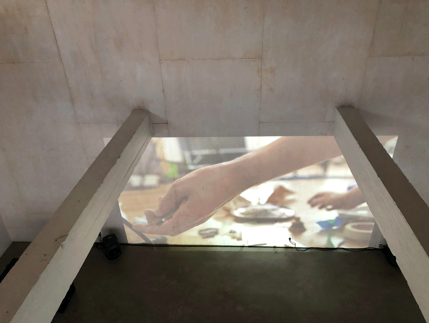 For example, I placed a single speaker at the top of the stairwell—facing its curved wall—that was dedicated to diffusing highly articulated object sounds, derived from my video etudes: Small Objects / Small Gestures. These sounds, which to my ears seemed as though they were being performed by “someone,” could be heard distinctly from any position in the gallery, but unless a visitor happened to be in the stairwell, it was not possible to know the sounds’ source, or who or what might be generating them. I also placed a line of loudspeakers along the upstairs walkway wall, and though the speakers were backlit, they were not readily visible, unless one happened to discover them by walking up the gallery stairs. Of course, the sounds diffused by the loudspeakers— mostly drones, multi-pitched feedback, and pitched-down rustling paper sounds— were clearly audible everywhere in the space. Nonetheless, an additional sonic separation/dislocation took place; depending on the location of the listener, only the upper partials of the drones could be heard coming from the speaker line, while the fundamental pitch emerged from the large subwoofer that was located downstairs in the first floor main gallery space. Other sonic and visual aspects of the exhibition included repeating elements that did not link up in terms of scale or timeline (or if they did, they only did so by chance).