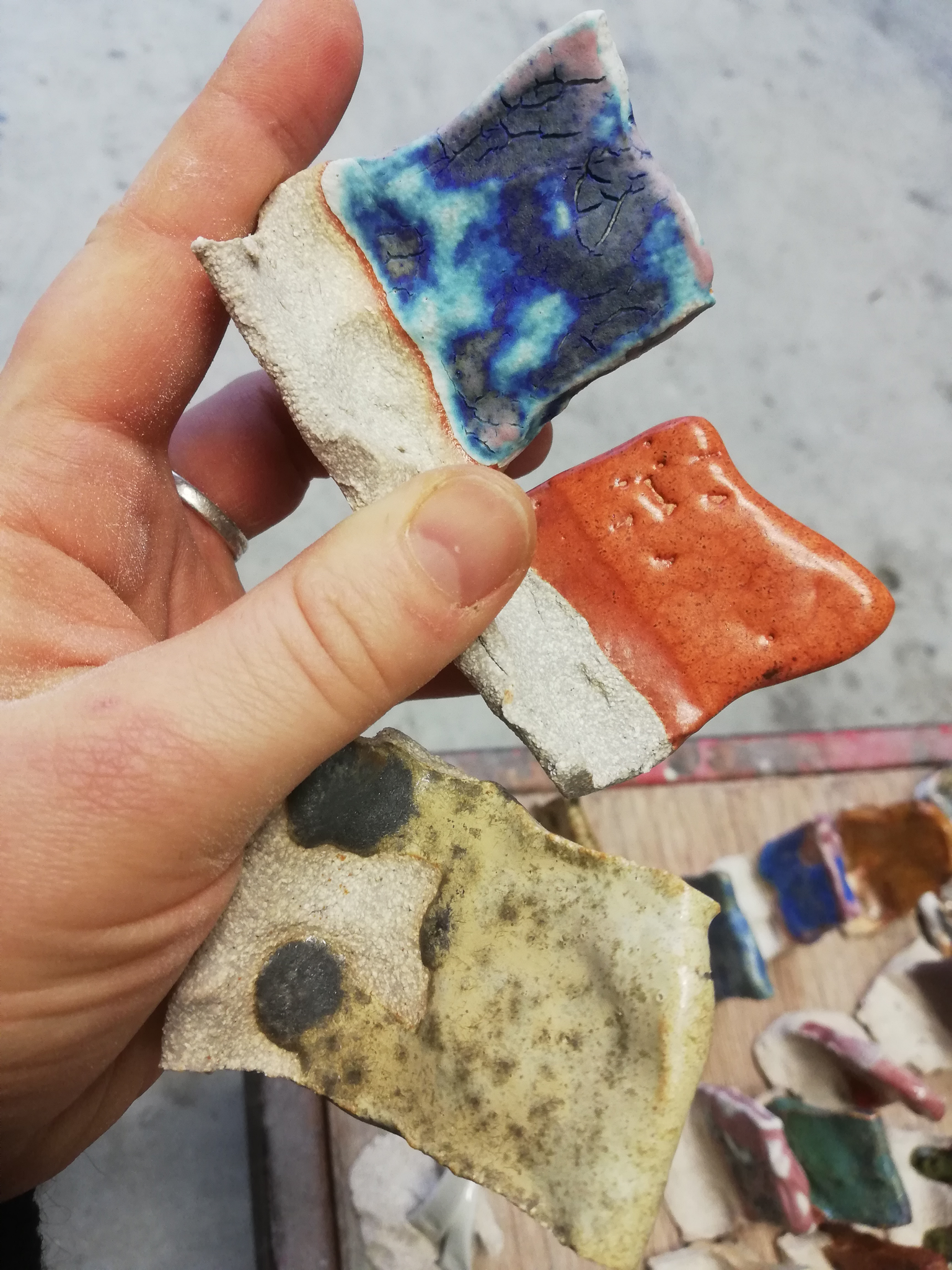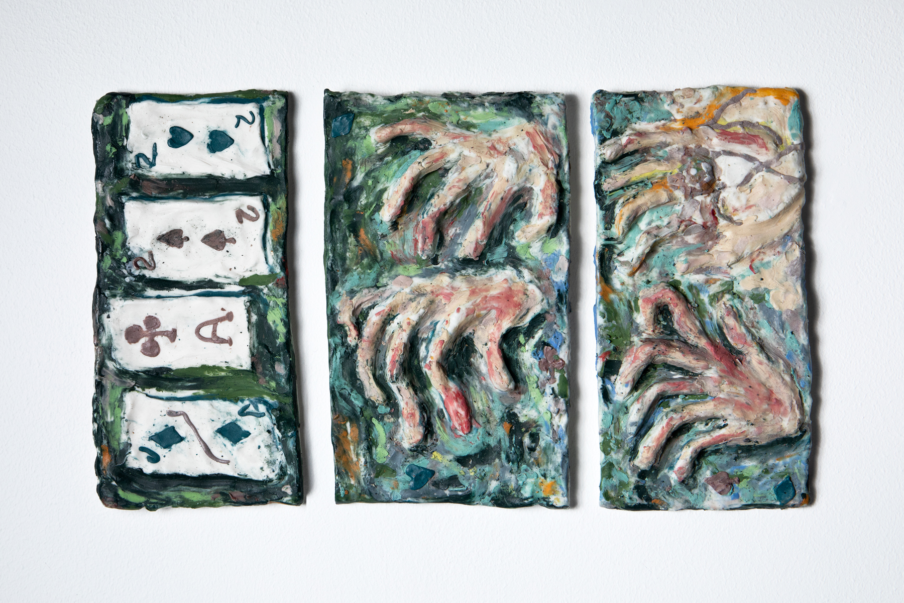 The bodily presence of clay embodies weight and brings forth form and scale, whereas coats of glazes melt as surface and minerals materialize as textures and colors. Mapping out of the respective affordances of clay and ceramics helps me to understand how clay materials and ceramic processes suspend the artistic expression in unique way, and are connected to the discussions and artistic research projects connected to the material in contemporary art field. Clay´s relationship to color, glaze and scale also gets addressed, and I reflect on how different approaches contribute to the sculptural expression of the relief in different ways.