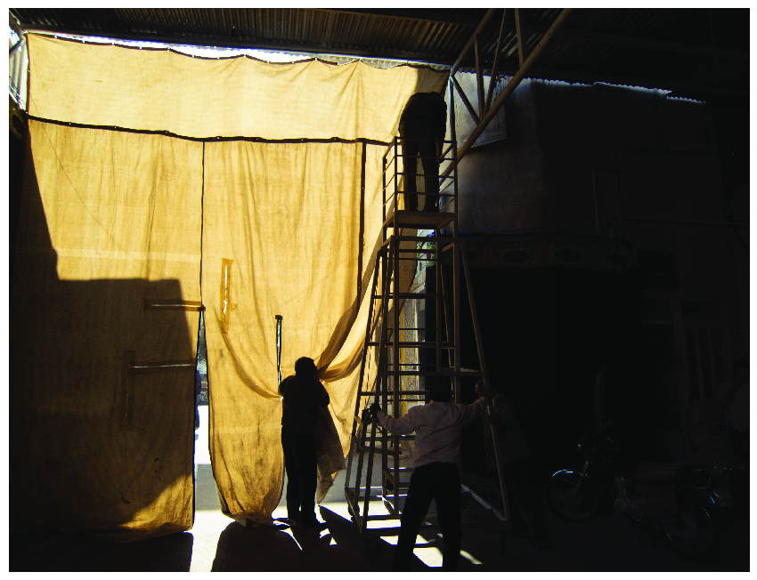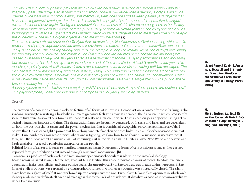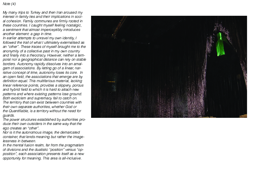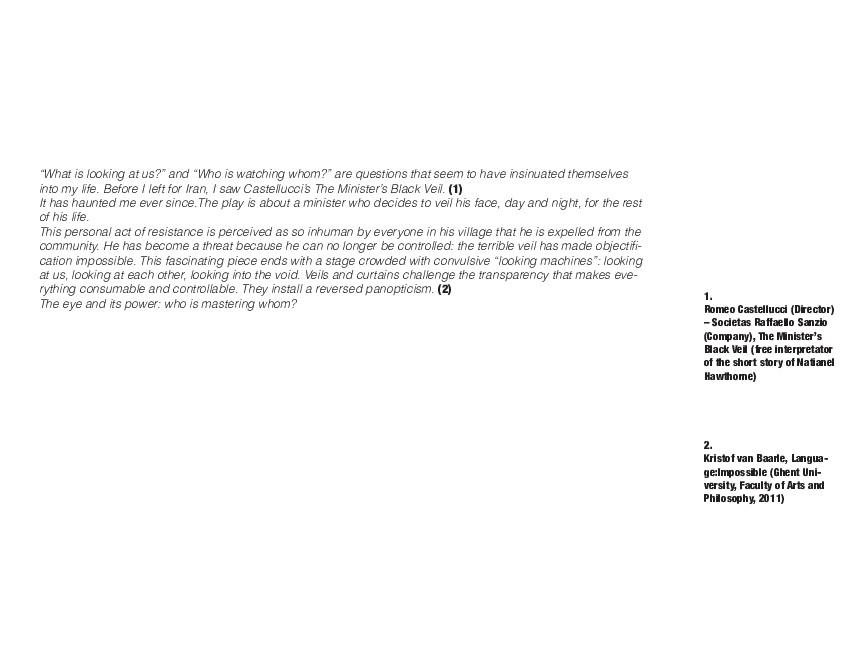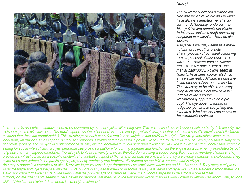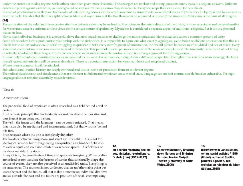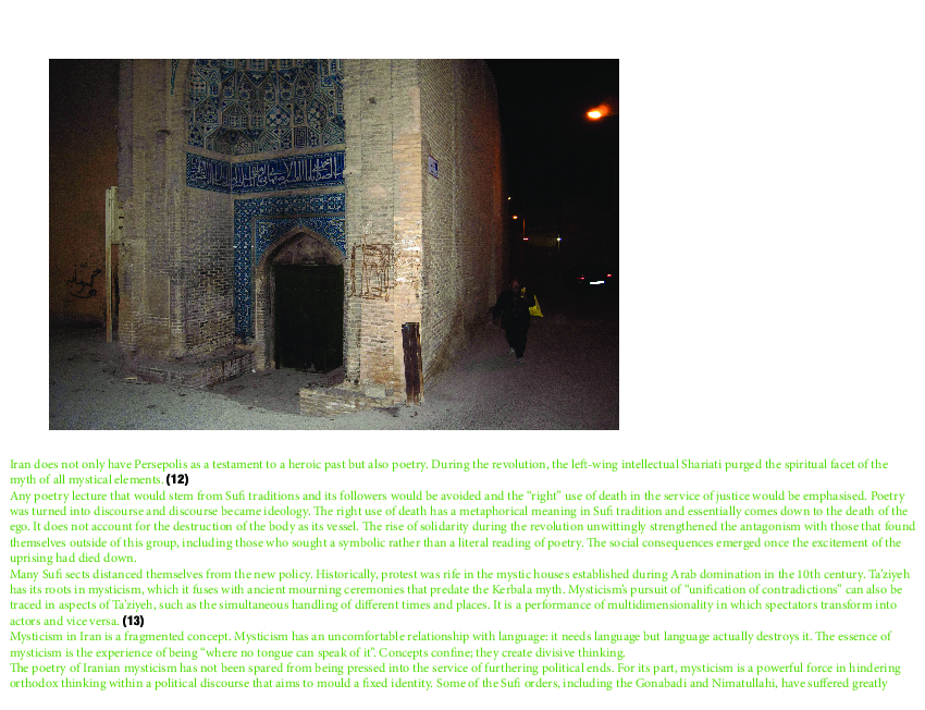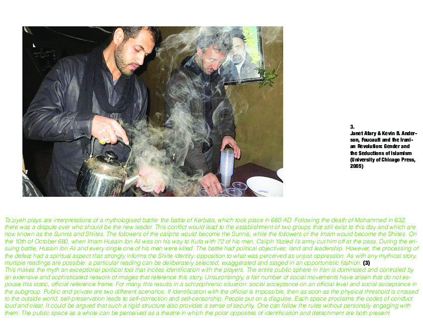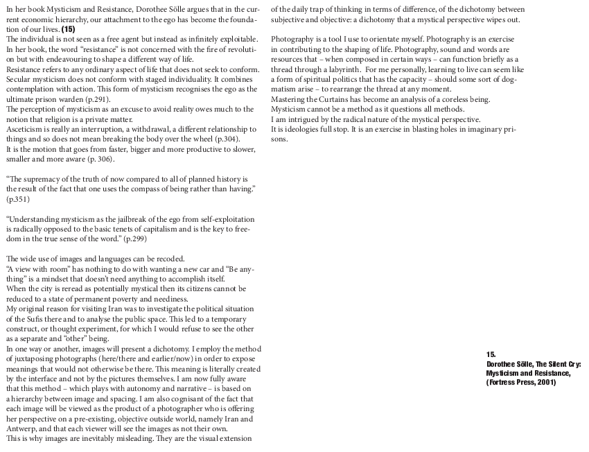 Mastering the Curtains is a photographic research of 2 perspectives in the Islamic Republic of Iran: on the one hand the public and transparent, on the other hand the hidden. The first approach focuses on the content and implementation in the public space of the old popular and politicized street theatre Tazi’yeh. The second approach explores the hidden world of the Sufis and their political difficulties within the current policy. Originally, these seeming opposites have common ground in Iranian collective memory through a rendition of social and spiritual resistance. The four-year research process involved continuous oscillation between exploration and self-reflection. Reflections on religion, other and I, position and opposition, private and public, transparency and control are combined with series of images as in a 'flow of consciousness’. This results in a multi-media use of text, images and sound that boosts the simultaneity of places and times. The social potential of secular mysticism is distilled from this research. The book Mastering the Curtains is published by Art Paper Editions.