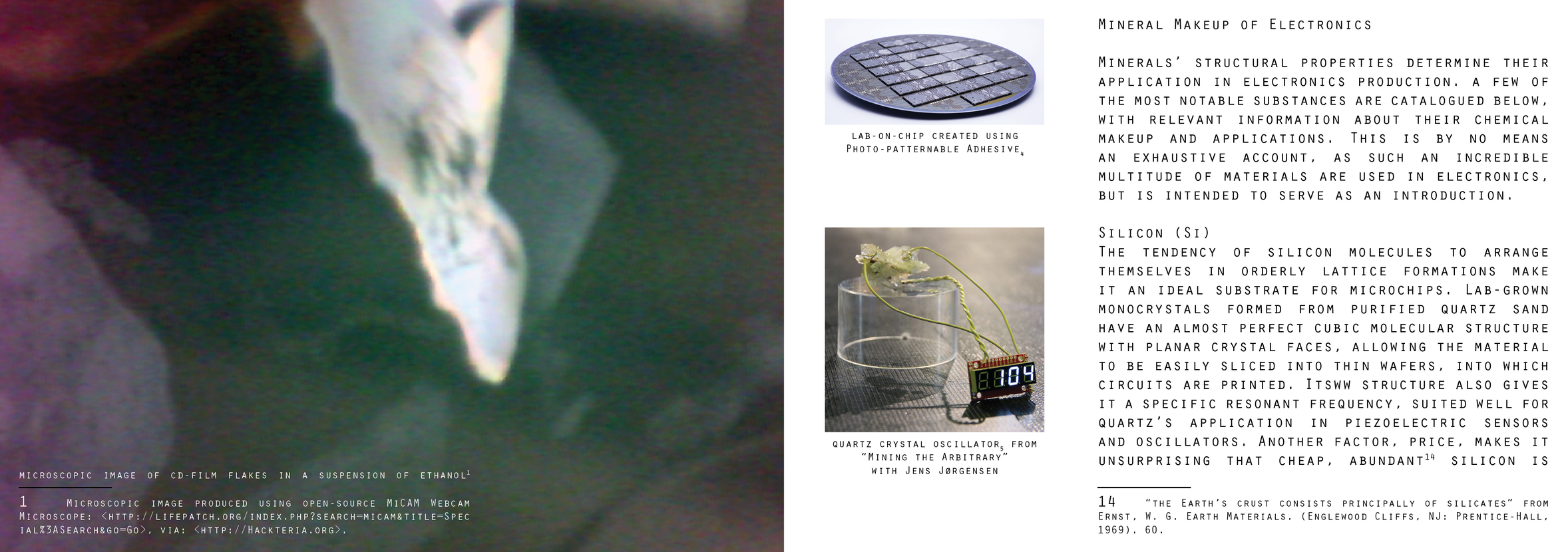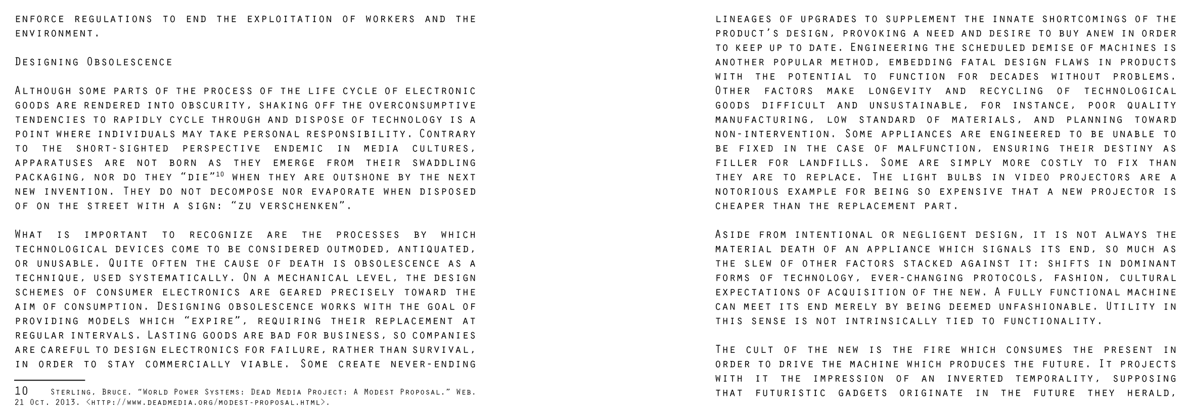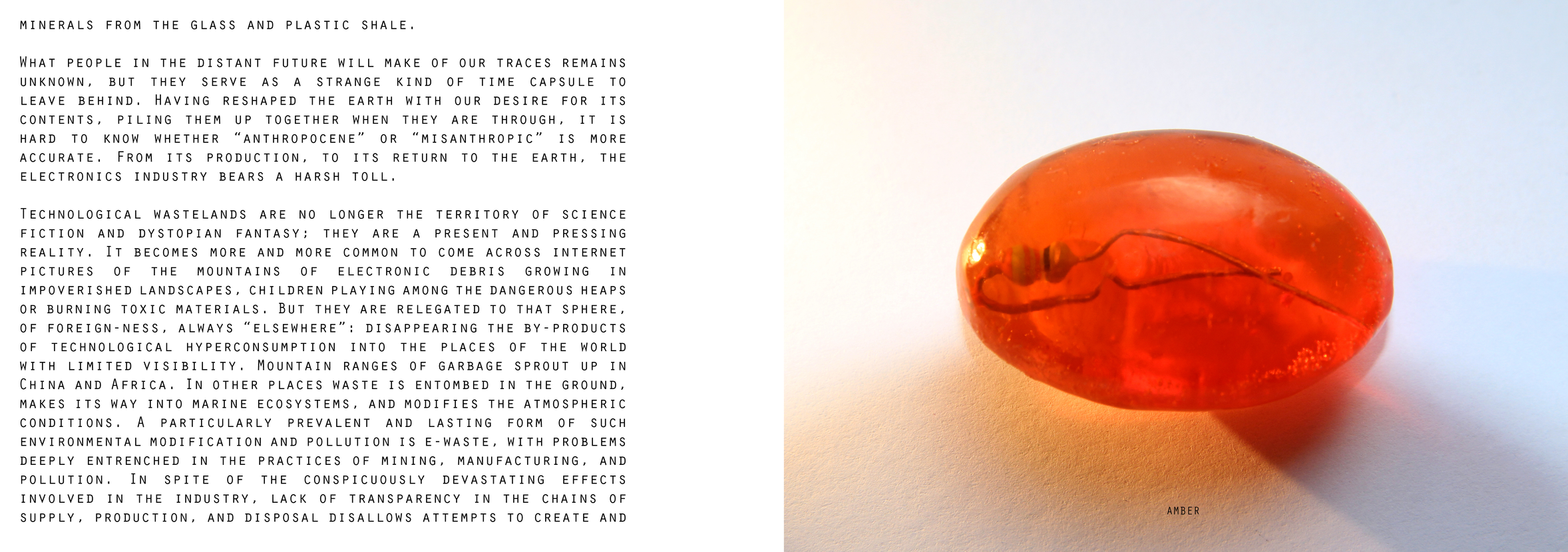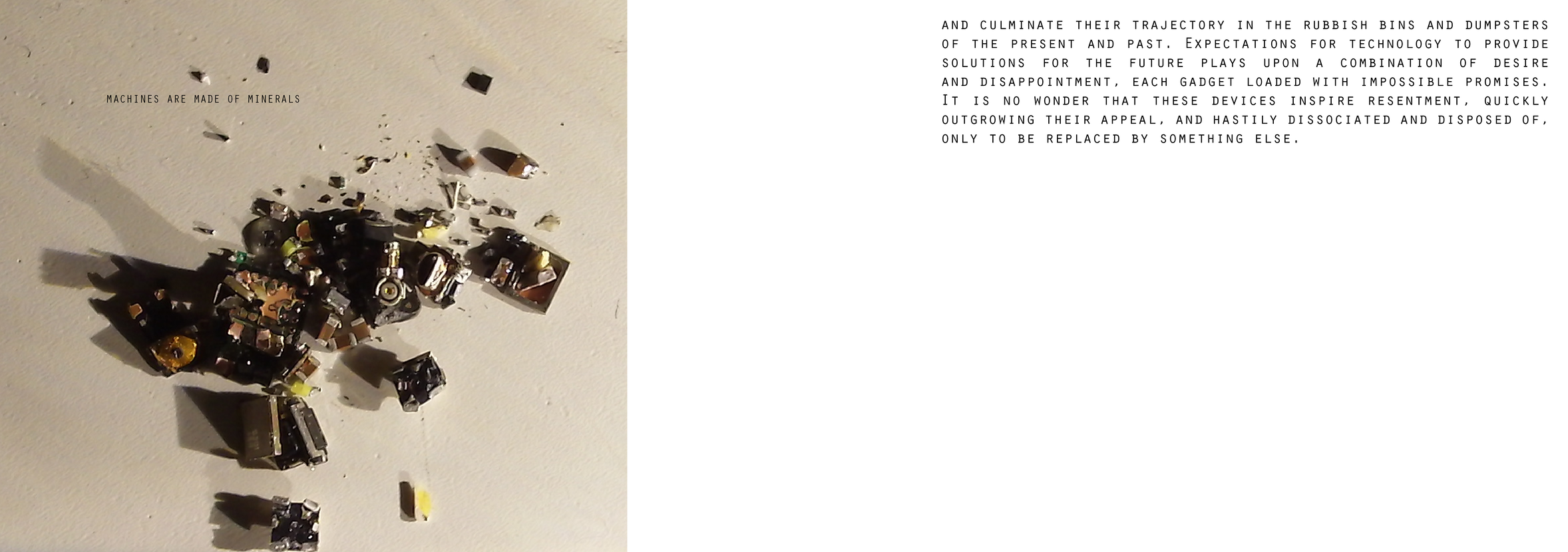 Investigating the interrelated nature of the materiality and temporality of the media apparatus, Molten Media takes a deep time view of a rapid-cycling throwaway culture. It is a culture paradoxically obsessed with the accumulation and storage of codes, though the devices used to store and access them are considered disposable. In spite of the impression that our gadgets expire almost as quickly as they are created, the social and ecological byproducts of this phenomenon are far-reaching and present formidable challenges for the future. Considering the methods through which data is encoded and decoded in matter, we also approach the material side of apparatuses which become increasingly intangible, yet litter the earth with pock-marks and mountains of e-waste. Projecting an alternate timescale for the media apparatus allows a reframing of our relation to natural history, speculation potential outcomes and openings for alternative methods of media production and reception.