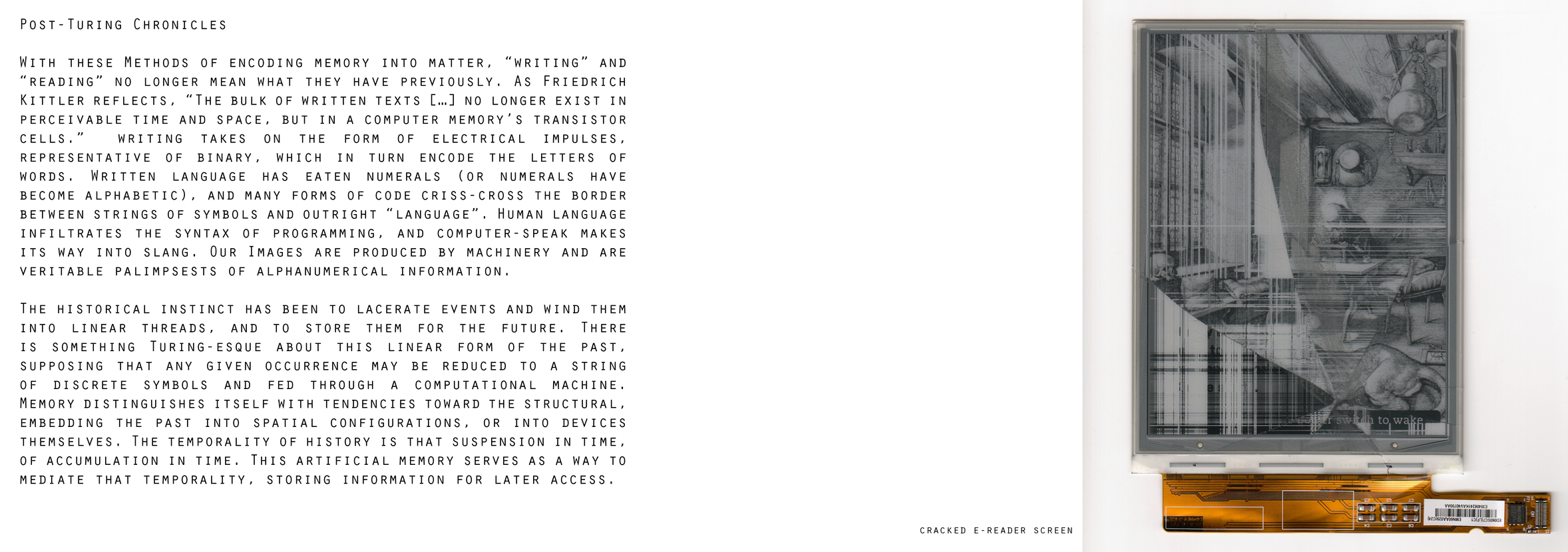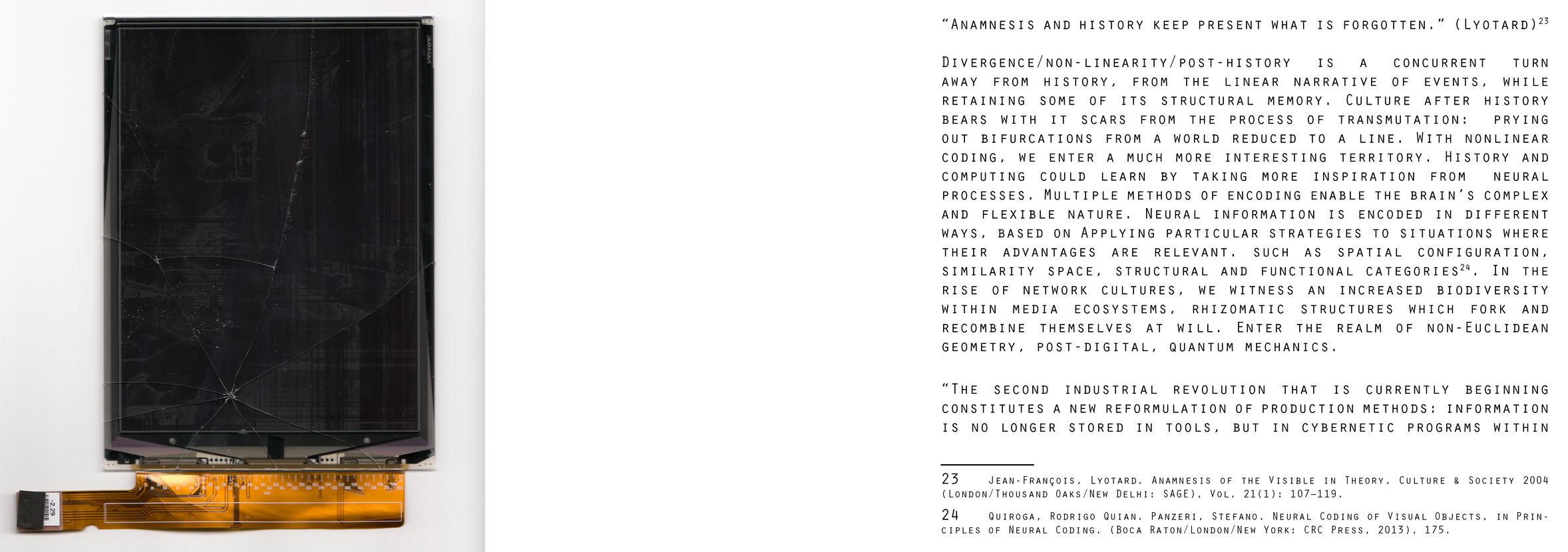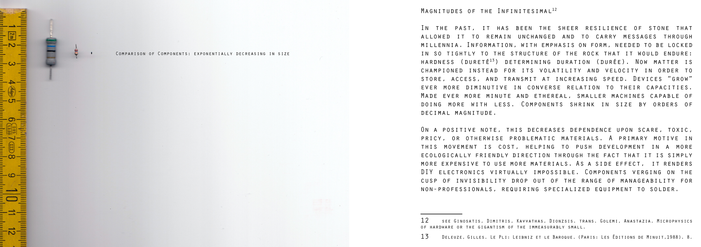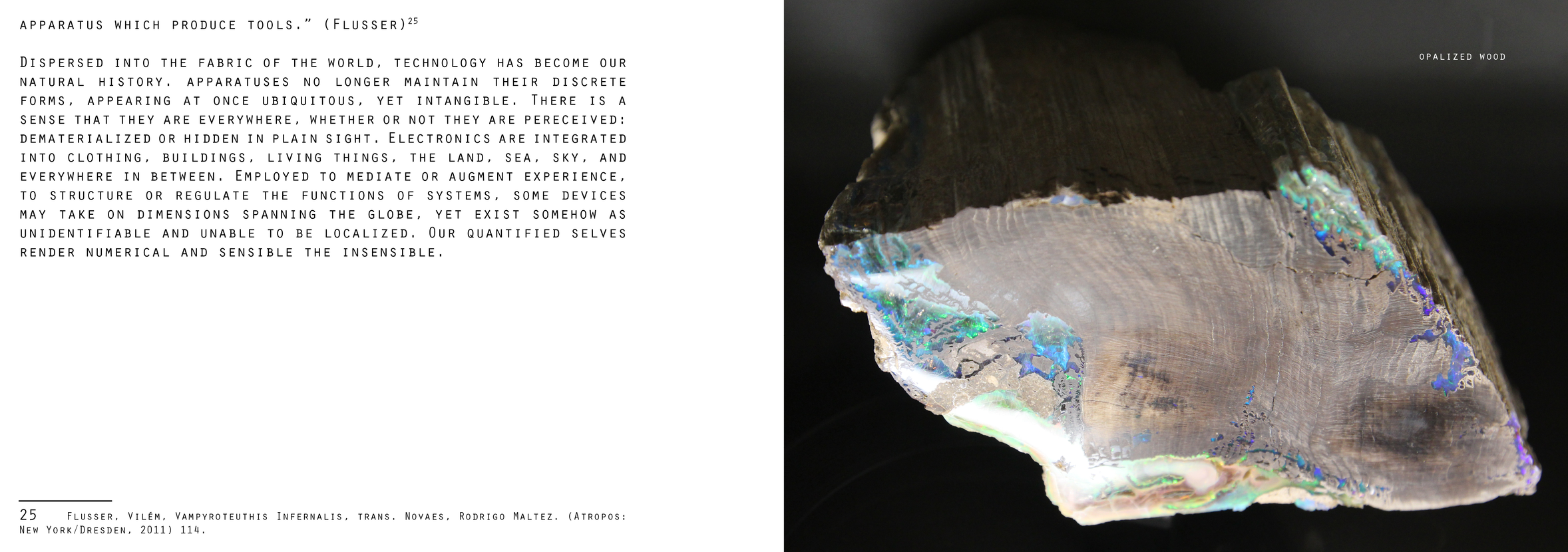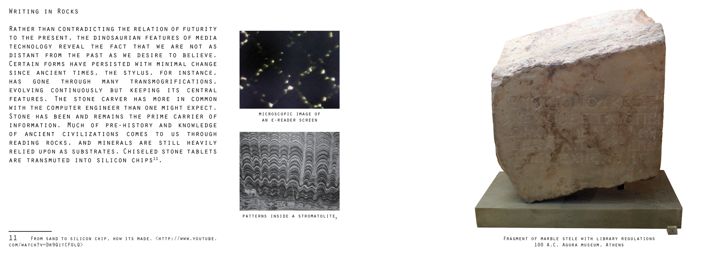 Investigating the interrelated nature of the materiality and temporality of the media apparatus, Molten Media takes a deep time view of a rapid-cycling throwaway culture. It is a culture paradoxically obsessed with the accumulation and storage of codes, though the devices used to store and access them are considered disposable. In spite of the impression that our gadgets expire almost as quickly as they are created, the social and ecological byproducts of this phenomenon are far-reaching and present formidable challenges for the future. Considering the methods through which data is encoded and decoded in matter, we also approach the material side of apparatuses which become increasingly intangible, yet litter the earth with pock-marks and mountains of e-waste. Projecting an alternate timescale for the media apparatus allows a reframing of our relation to natural history, speculation potential outcomes and openings for alternative methods of media production and reception.