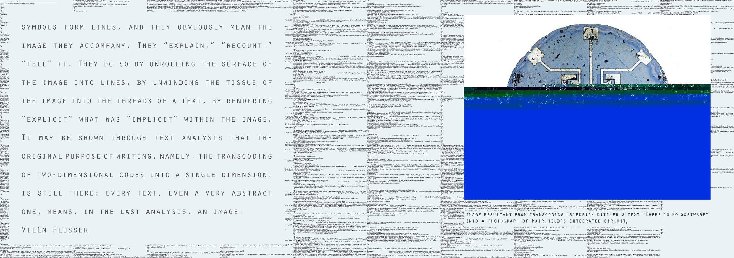 image produced by transcoding the text of Friedrich Kittler's There is No Software into an image of the first integrated circuit