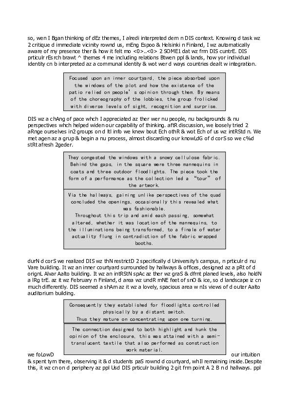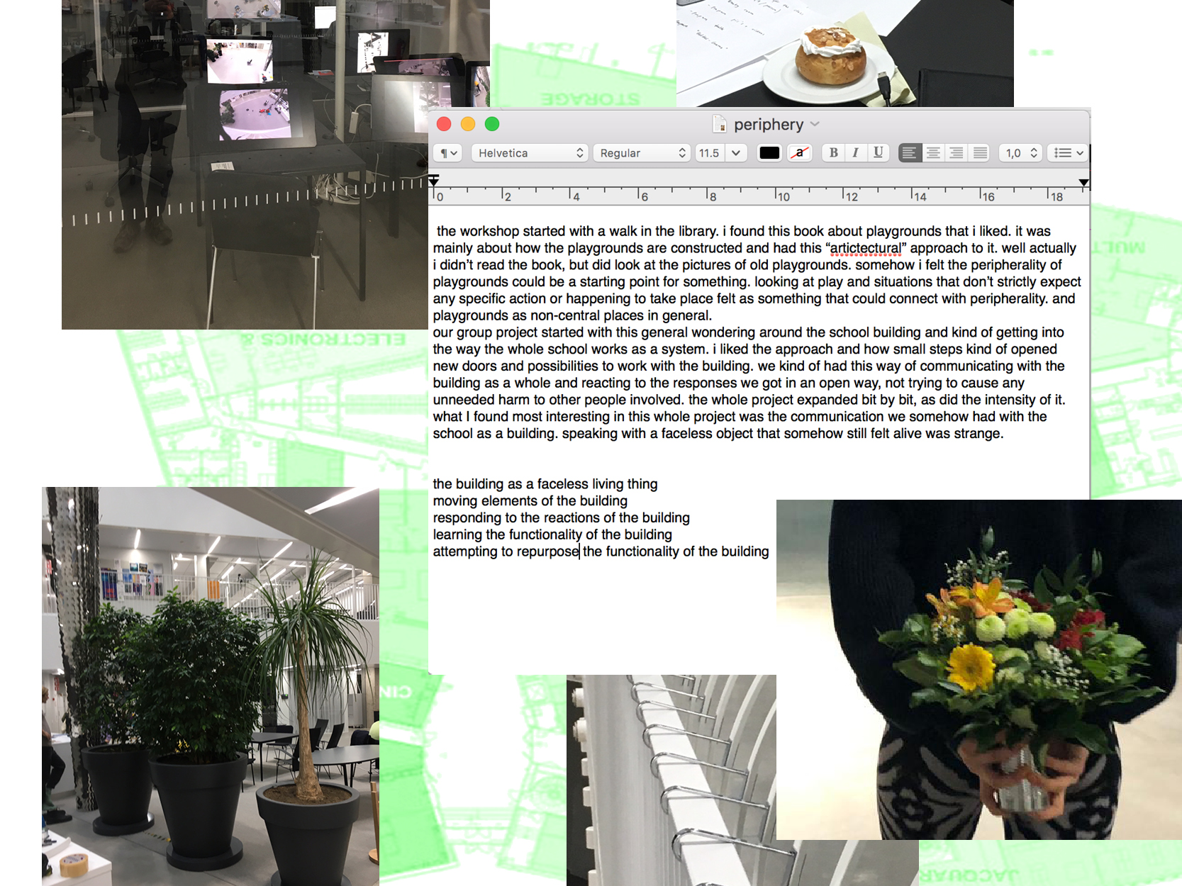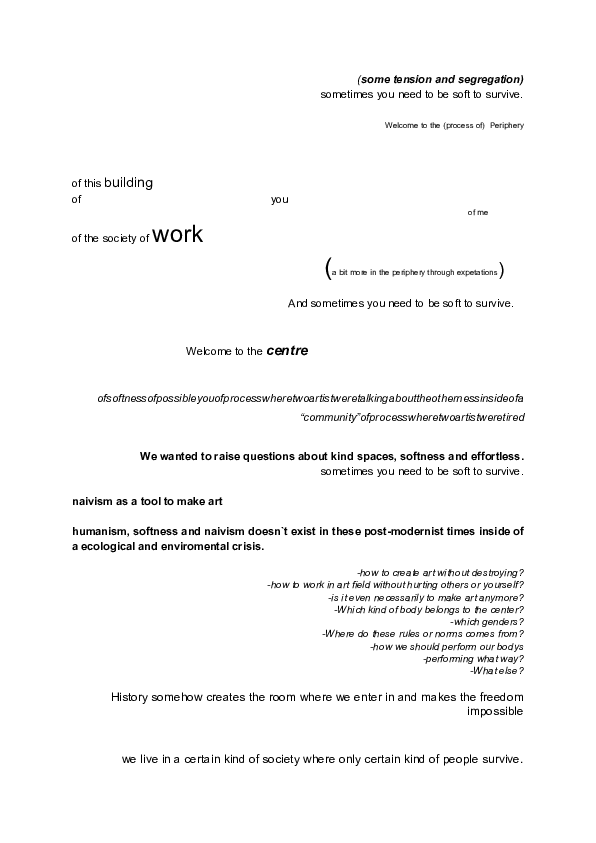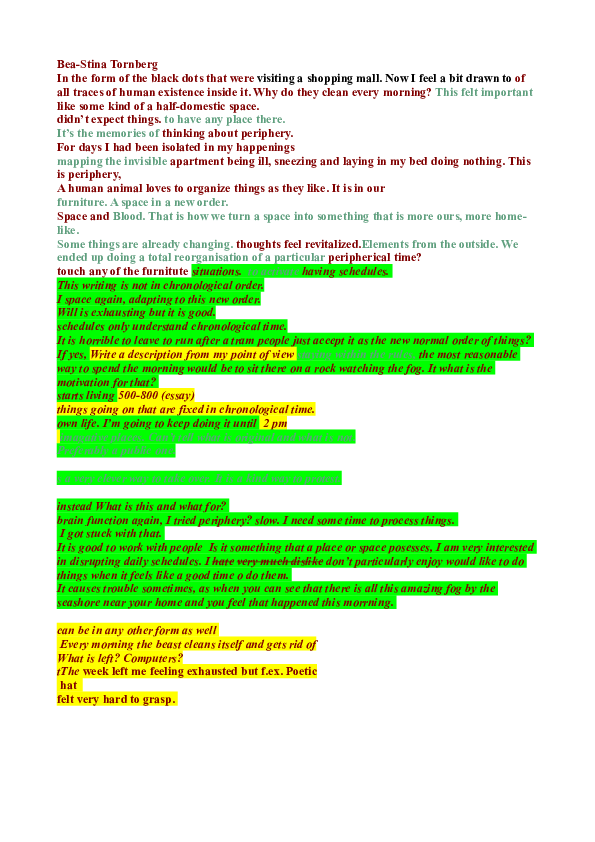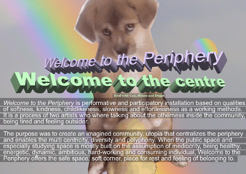 COMPOSED BY Bea Tornberg / Virpi Nieminen / Una Auri / Oscar Dempsey (ELO Scenography) + Mirka Sulander / Adrian Mc Grath / Tuomas Lehtomaa / Minna Lund / Zahrah Ehsan / Worapoj Inlao / Klaudie Osickova (ViCCA Visual Cultures, Curating and Contemporary Art MA program) / Maiju Loukola (workshop supervisor @Aalto ARTS)