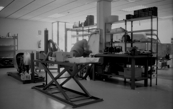 Series were made up of about six units each, all of which remained statically held to benches throughout the complete production process. Workers moved around the benches, repeating each action six times before moving on to the next. Serial production is a concept that evolved parallel to technological development and organisational engineering. Today, motorcycles move along robotised assembly chains. Six-axis robotic arms perform many of the activities previously executed by humans. KUKA Robotics is the main robotic-arm producer for the automotive industry. A German company, its Spanish branch is located at 54 Argullós Street in Barcelona, not far from Carrer Clot, where Talleres Aragall originally stood.