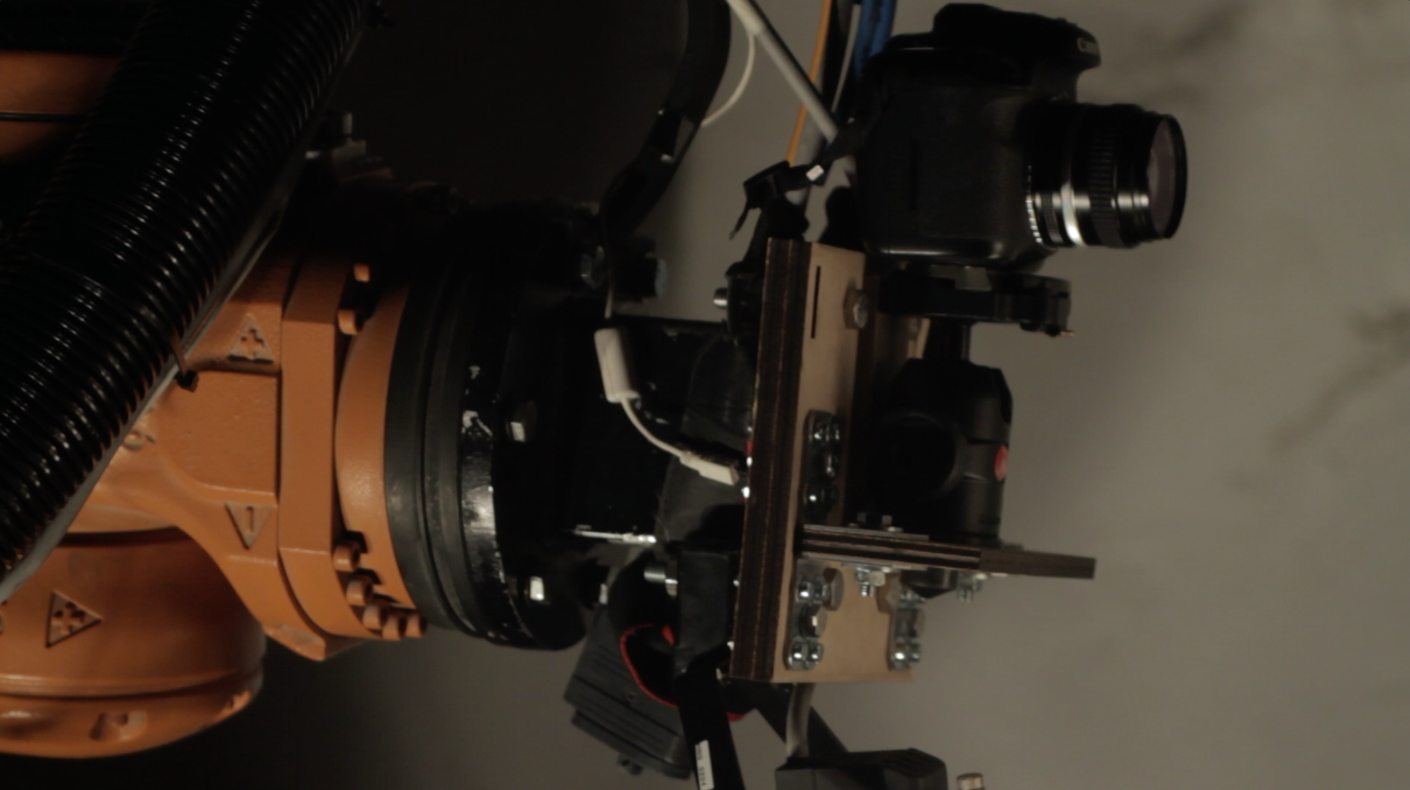 For this project one of the cameras was attached to a six-axis KUKA robotic arm’s head with a custom-made device that I designed and built myself. Shutter speed, fps (frames per second), and focus were set to fixed, constant values. The arm’s movement, and therefore the camera’s point of view, became the main variable at play, given these constraints.
