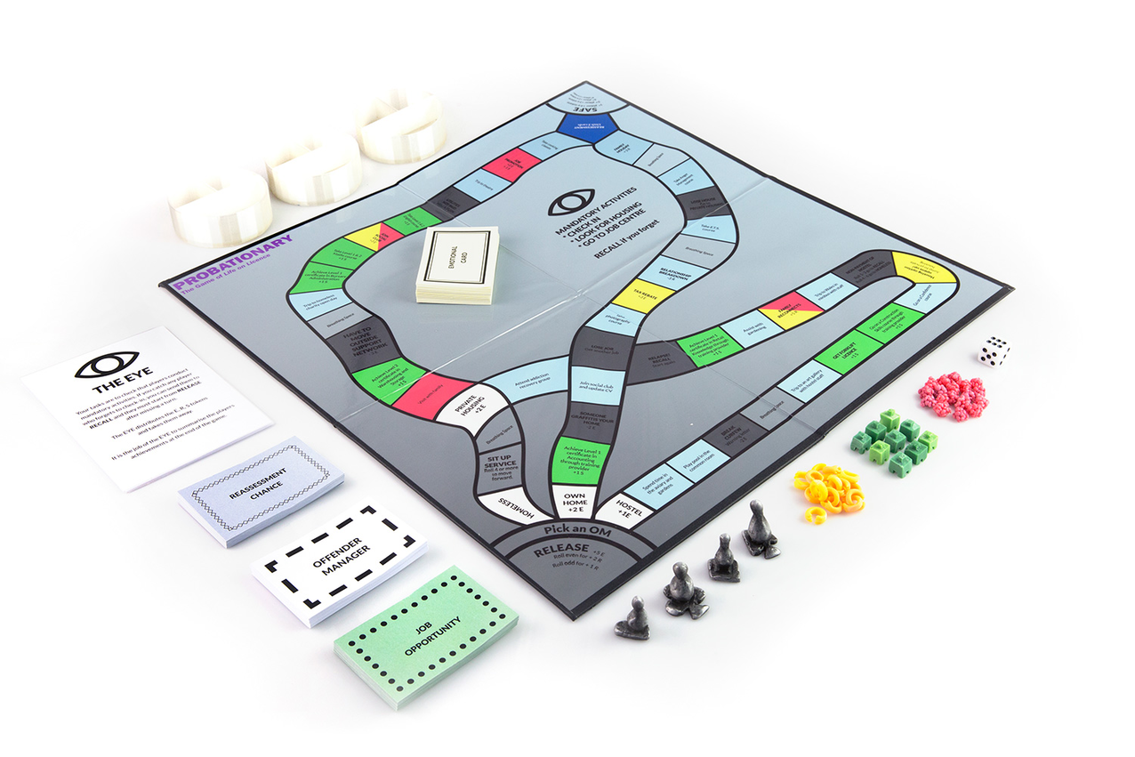Produced through workshops with men ‘on licence’, Probationary: The Game of Life on Licence explores the lived experience of being on probation in the form of a board game. The game takes its players on a journey through the lives of four playable characters as they navigate the complexities of the probation system.