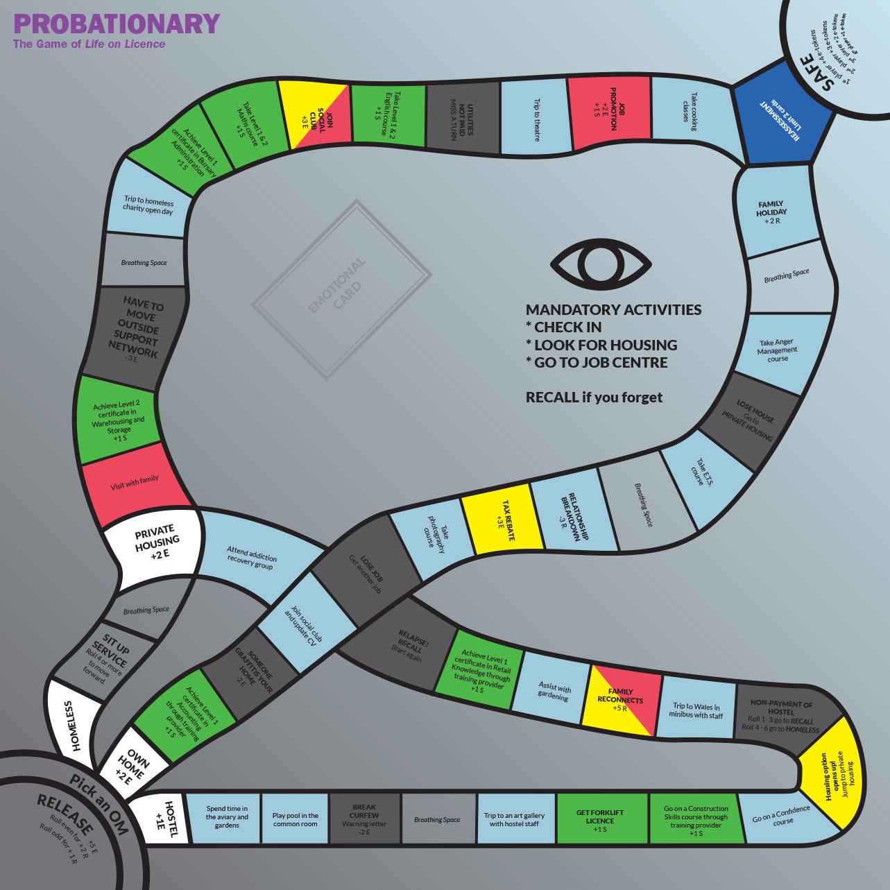 The object of Probationary is to get to the SAFE square with the most emotions, relationship and skills.