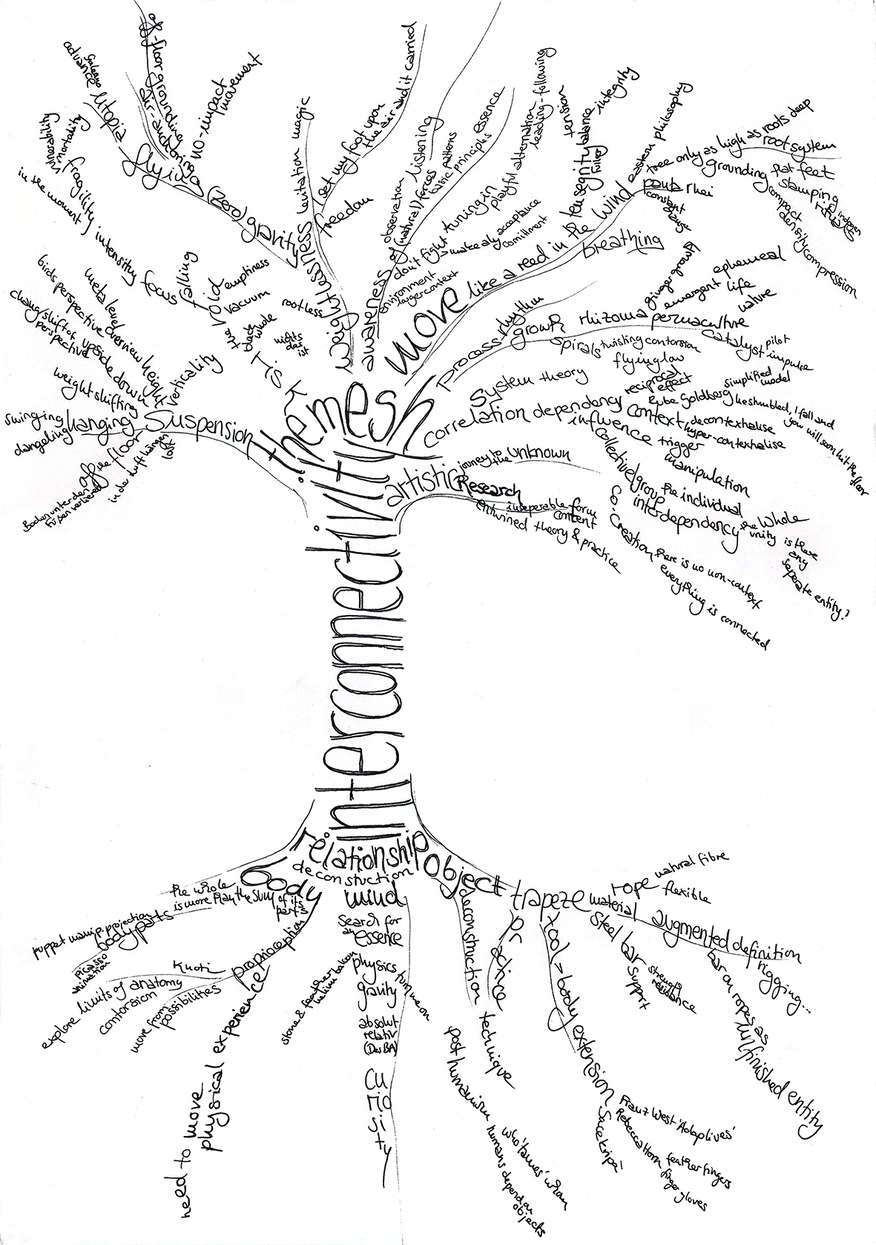 Within the practical part of this research I sort of literally translated the tree metaphor and made a tree root my aerial partner. I consciously use partner instead of 'apparatus' or object, because in order to apply these ideological concepts as proposed by Bennett to my field of aerial acrobatics, the 'object' as a seriously taken nonhuman body is in fact a co-creator of my piece. The suspended tree root in contrast to a more traditional apparatus like a trapeze has a sort of individual character, a unique natural, organic form, certain features of a 'personal' dynamic 'behaviour', a special texture and form.