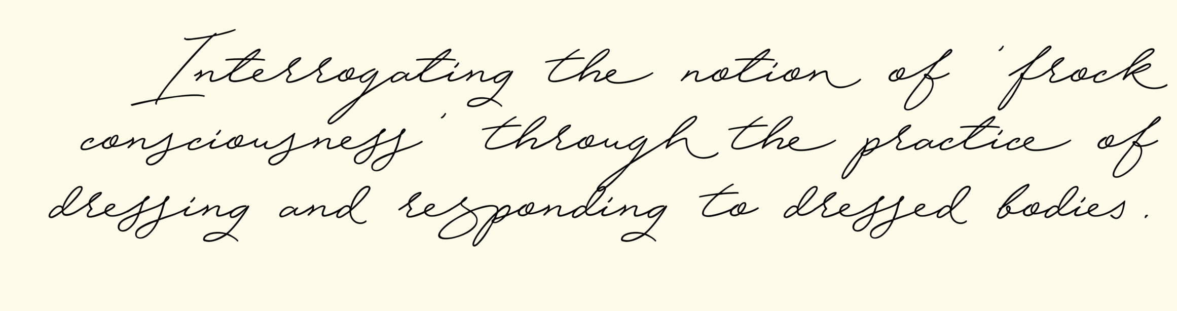 This research exposition reflects upon three projects made over thirteen years. The projects vary in form, format and reason for being. The common ground is that they all deal with the experience of the dressed body. The exposition uses Virginia Woolf’s concept of frock consciousness (1987: III. 12-13) as a framework for analysing how my work interrogates the experience of being-dressed-in-the-world.