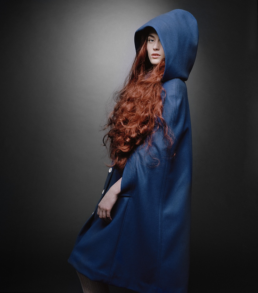 In the description referenced in making the piece Cilla’s Cape with Red Hair, Cilla describes her dyed red hair as synonymous with the royal blue cape. In my interpretation of the cape, a long red wig was sewn into the hood so that in wearing the cape, the wig is also worn; the hair is an integral part of the cape. This decision to sew the wig into the hood was an attempt to conjoin the memory of the coat and the hair Cilla describes of herself at the time. “royal blue and white and bright red hair at the time, so that must have looked a bit gaudy, but hey!”