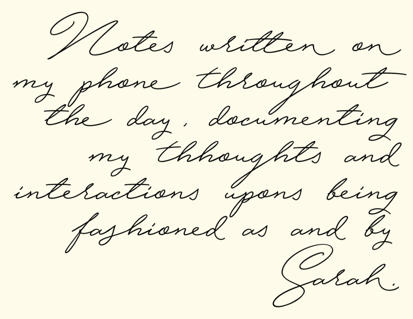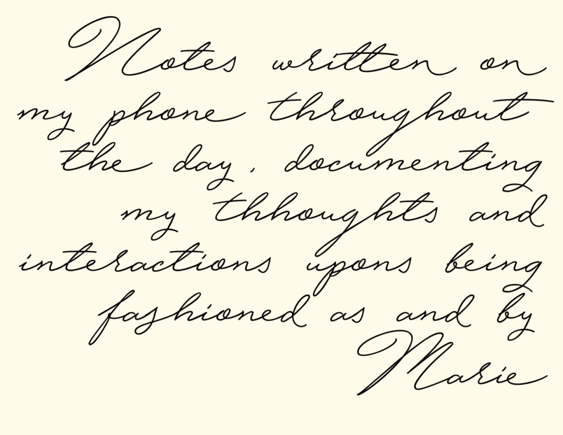 In endeavouring to understand the value, impact, and possibilities of fashioning on bodies and their consciousness, I developed a strand of work that documented the practice and process of fashioning my body in a way that I was unused to, through consciously undertaking acts of fashioning my body using materials and instructions provided by other people: Sarah and Marie.
