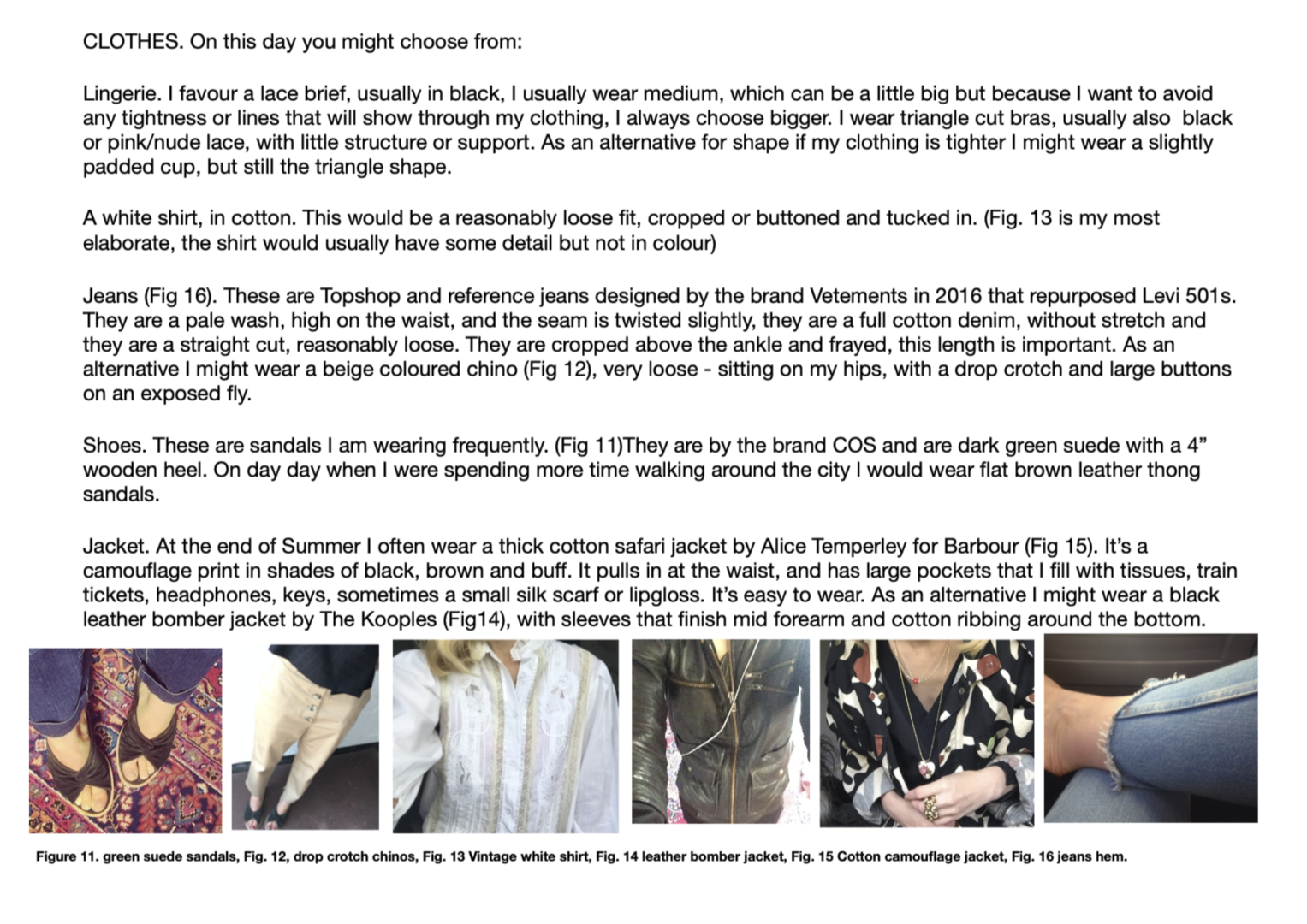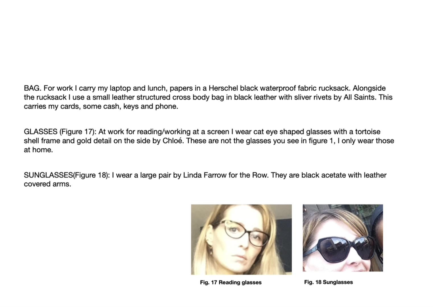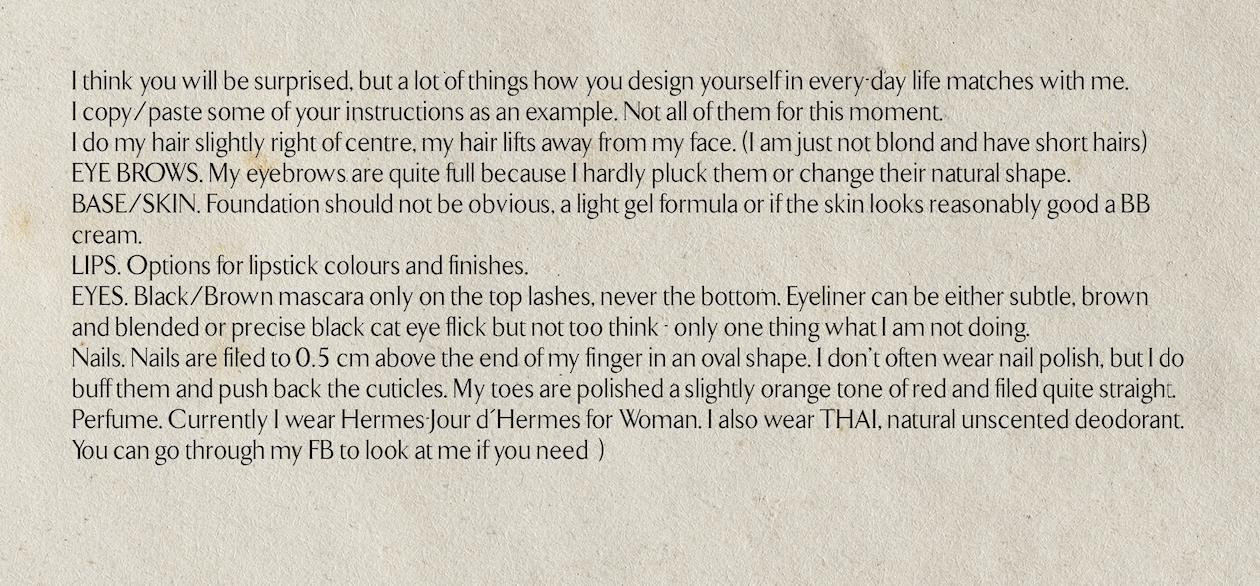 She instructed me on how to wear the clothes she provided, what to wear together, how it should be fastened or left unfastened as well as how I should style my hair and make-up each day. I was in contact with her as I conducted the experiment, she provided guidance where possible, allowing me to defer decision making about my self-fashioning to her. I engaged in my usual activities of teaching MA Creative Direction for Fashion & Beauty, conducting meetings with other staff in the school (some of whom are also fashion subject academics, others who are not) and working in my office.