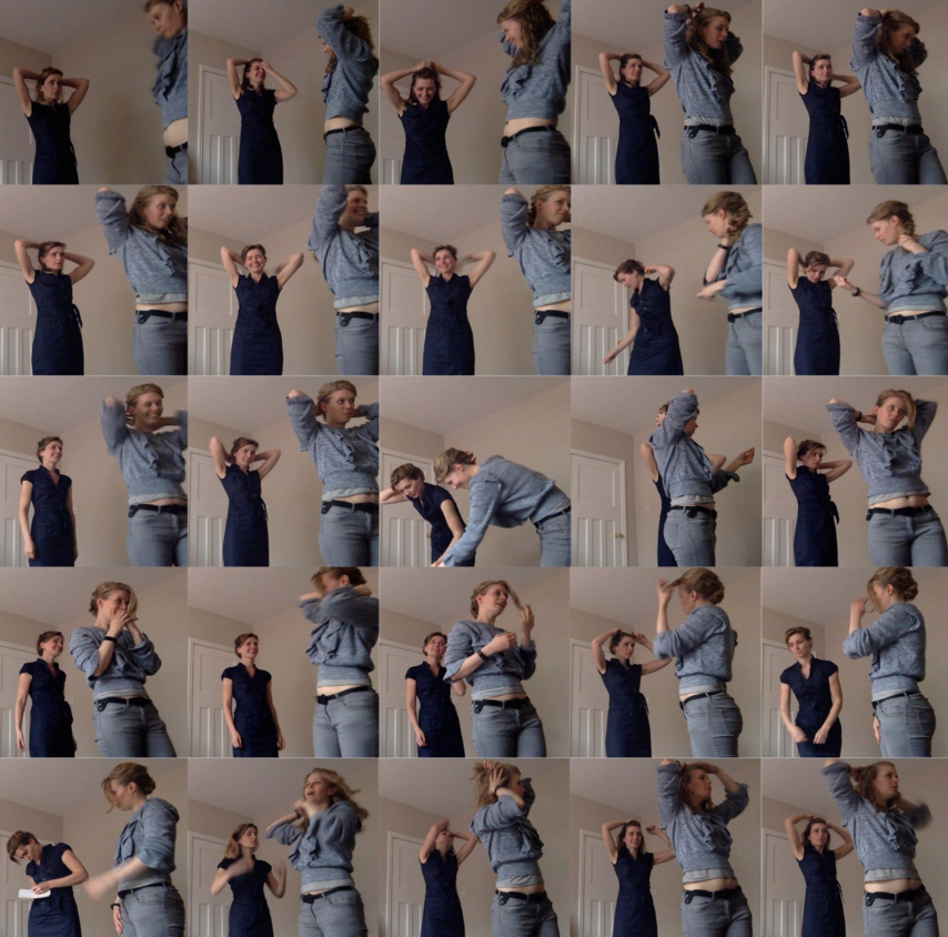 Film stills that capture frame by frame the process of learning to style my hair as Sarah styles hers, following her actions and gestures and letting her guide and correct me. The gestures when frozen in each frame begin to look like a dance to me.