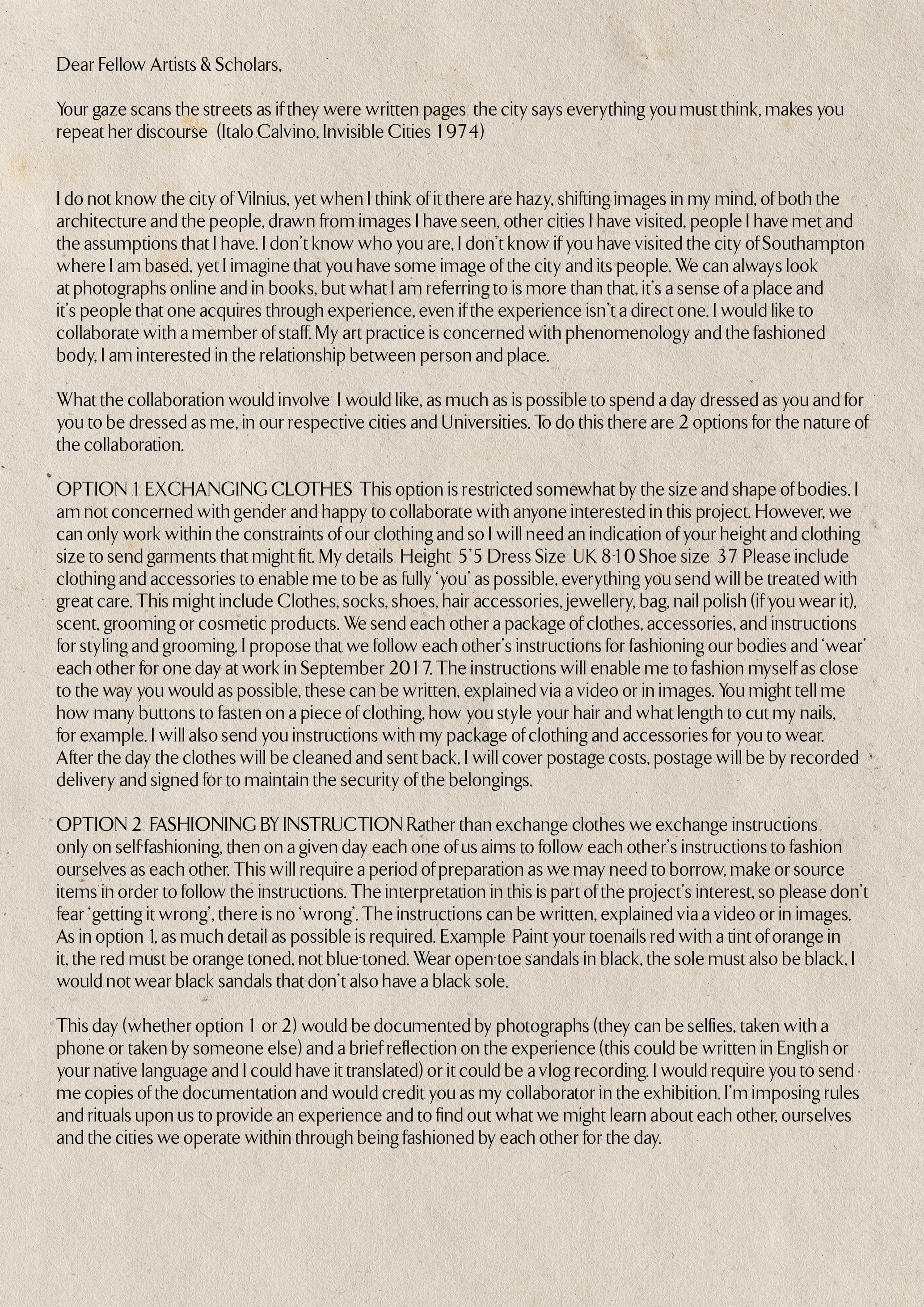 The second person I fashion myself as is Marie, an Associate Professor in Visual Arts at a University in Eastern Europe. I am interested in working in collaboration with someone who is a genuine stranger, and a request to participate in a group exhibition facilitates this opportunity. Marie responds to a call I send via email through a mutual contact to the academics at her institution to undertake a project with me, whereby we ‘swap’ our corporeal identities. The exhibition is related to cities, and so there is framing around this in the letter I send out, but that is not relevant to explore here. (*Marie is a pseudonym)