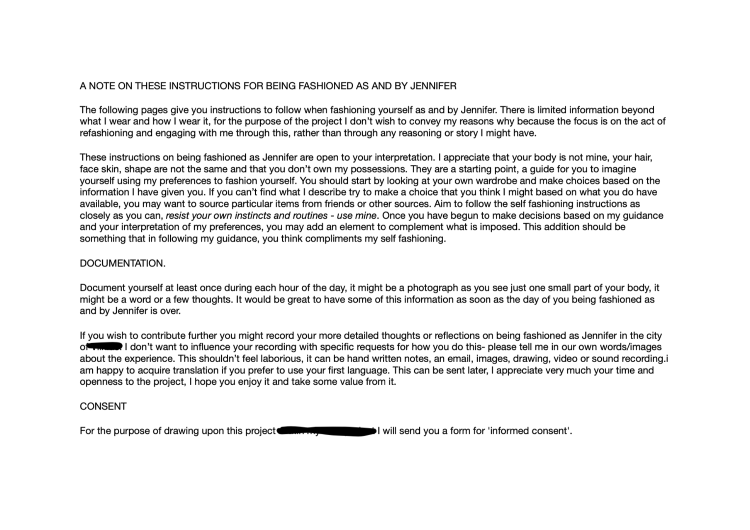 To further develop my understanding of frock consciousness - the experience of how my self-fashioning was impacting on my experience of being in the world - I produced instructions to be used by someone else, to enable them to fashion themselves as me.