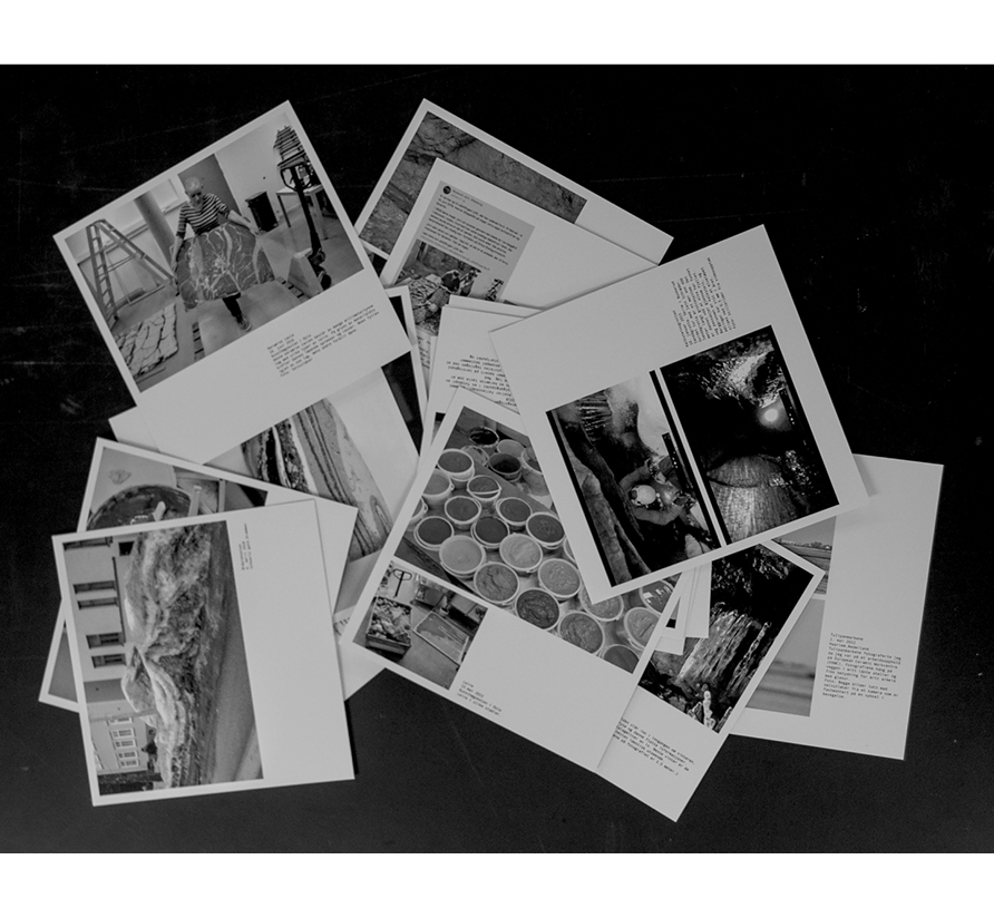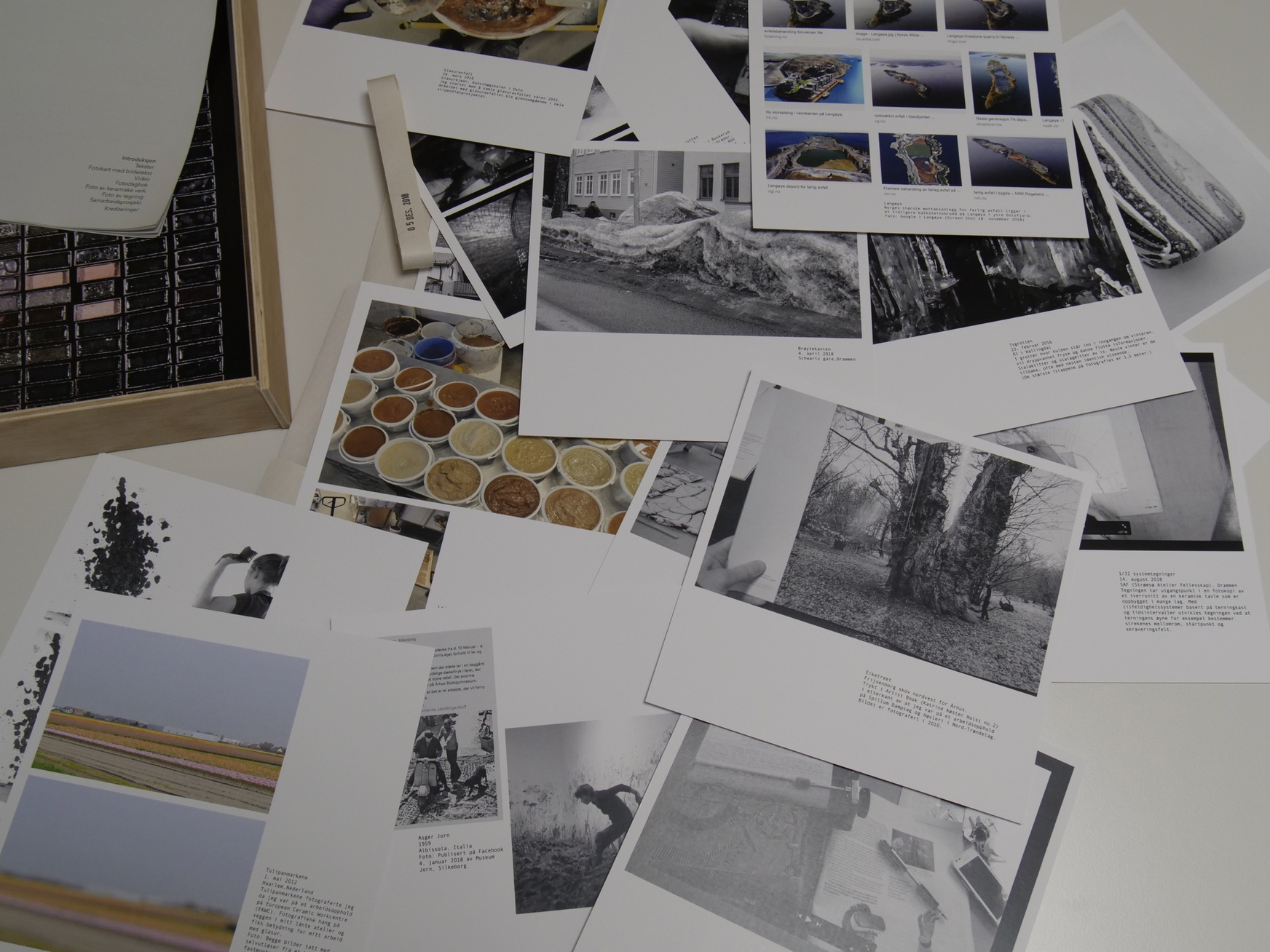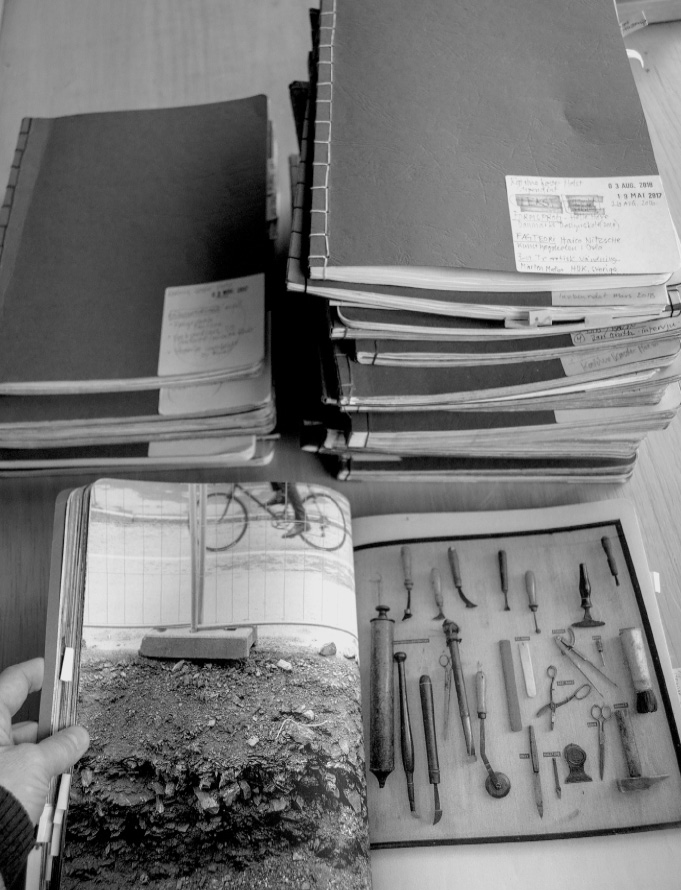 Fotografier fra arbeidsprosesser, feltarbeid, skissebøker og annet innhentet materiale er blitt kontinuerlig samlet i ordløse fotodagbøker. Bøkene har vært et viktig verktøy for mitt skriftlige arbeid og et redskap for å få øye på uventede sammenhenger.