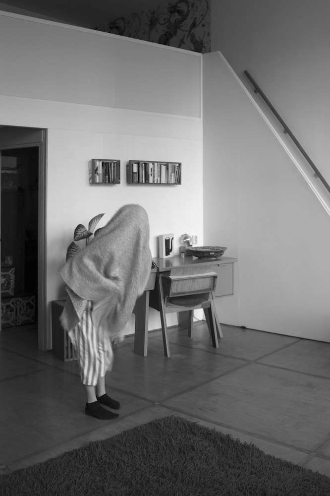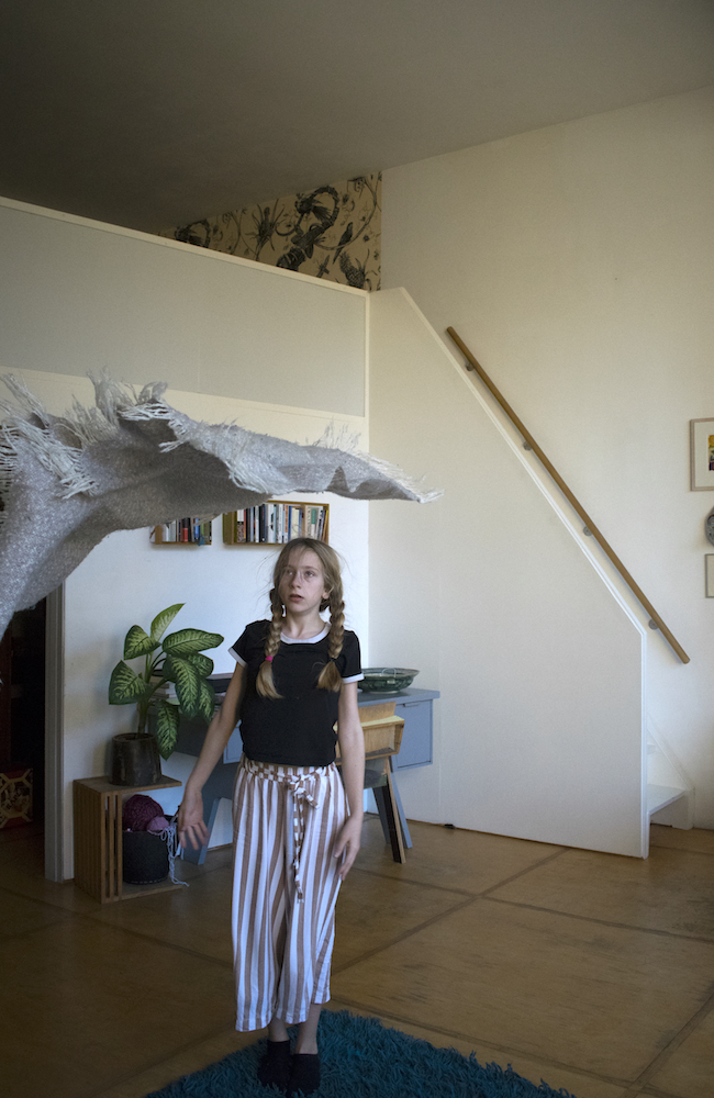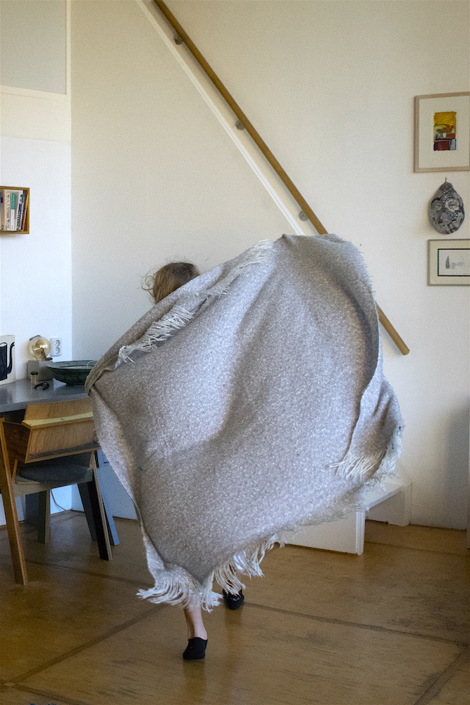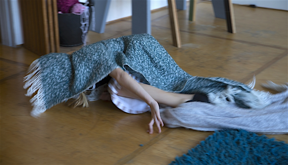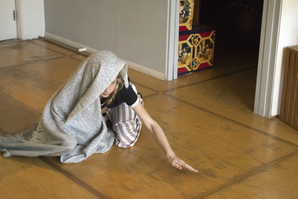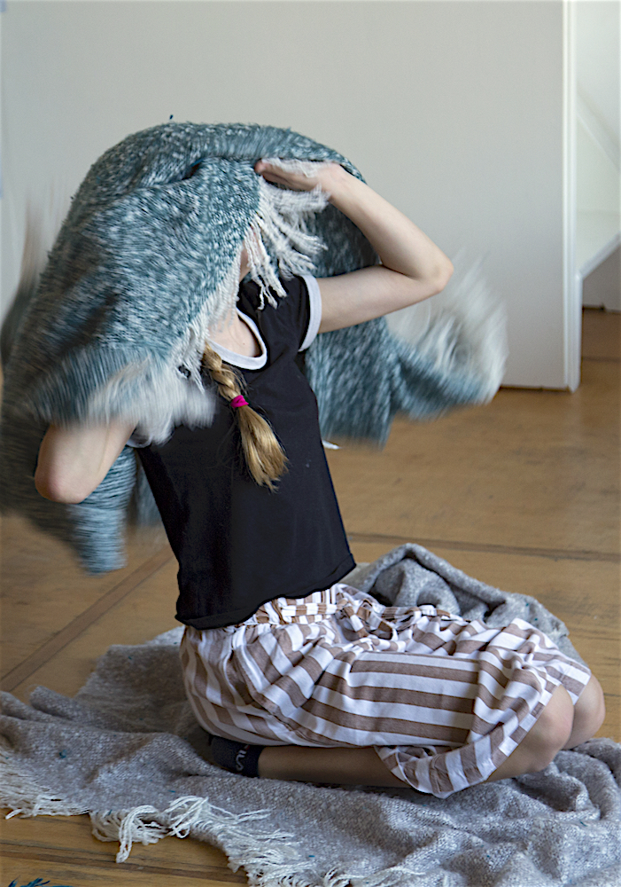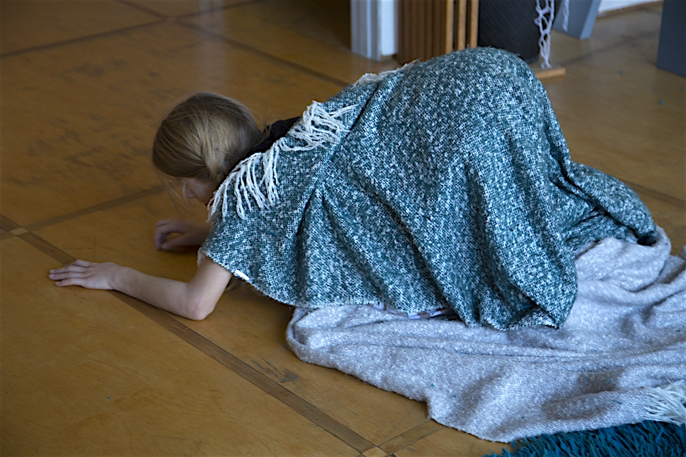 She stands up, runs and flies. When the running and flying are exhausted, she lands on the blue carpet. ‘Water’ she says in an associative mood. ‘What happens when I touch the water?’ It is not a question that is directed to me since she seems not to expect any answer from me. The question is directed towards herself. ‘I become a fish’, she answers. Immediately she starts to moves in a fishy way. The blanket is part of her transformation. Lisa wraps it around her, as a second skin, and soon the blanket and her body transform together in scales, fins and the tail of a fish. The blue carpet is the water: as long as Lisa is in the water, she is a fish. Lisa swims and dives around, and before she knows it, she accidently rolls off the carpet on the wooden floor. ‘The earth’, she says. ‘What happens when I touch the earth?’ ‘I become a mole’, she answers. Voilà, her body transforms into a mole. She crawls around, blindly, and hits a small wooden table. ‘What happens when I touch wood?’ ‘I become a beaver’, she answers