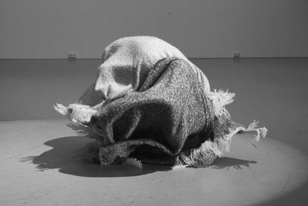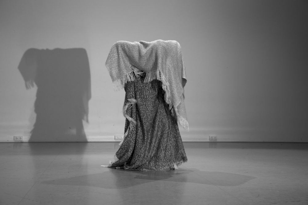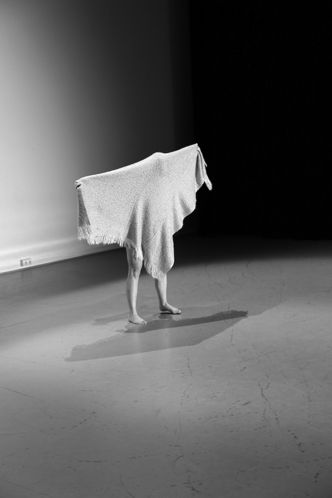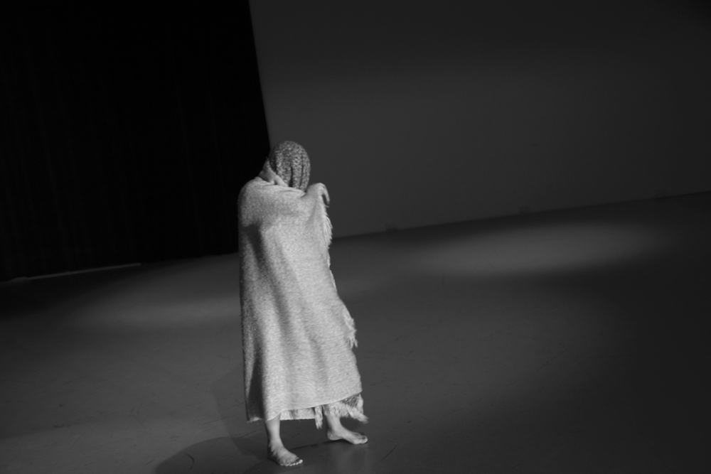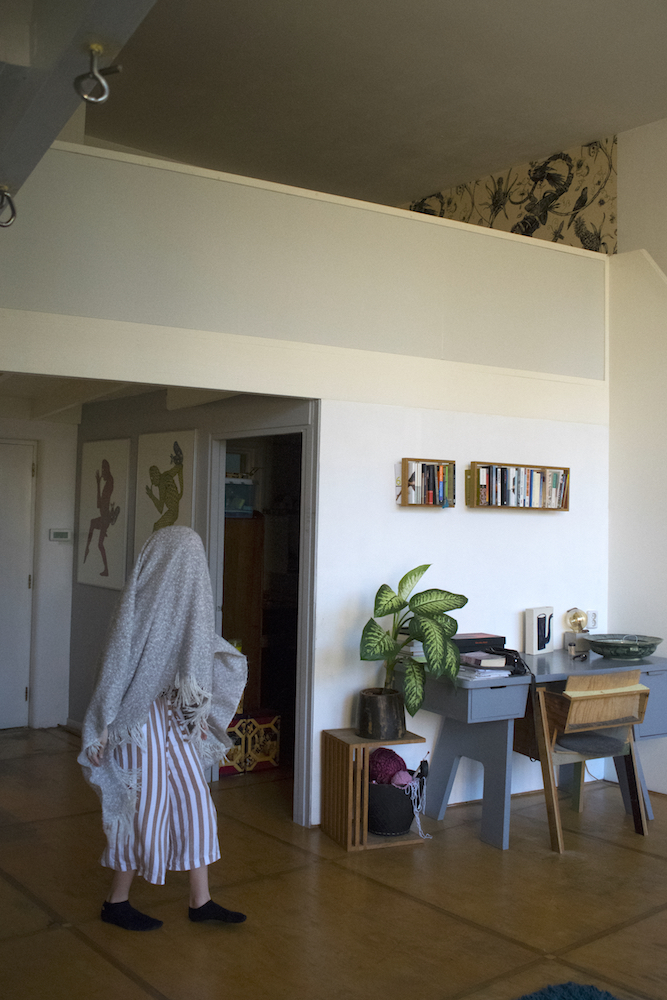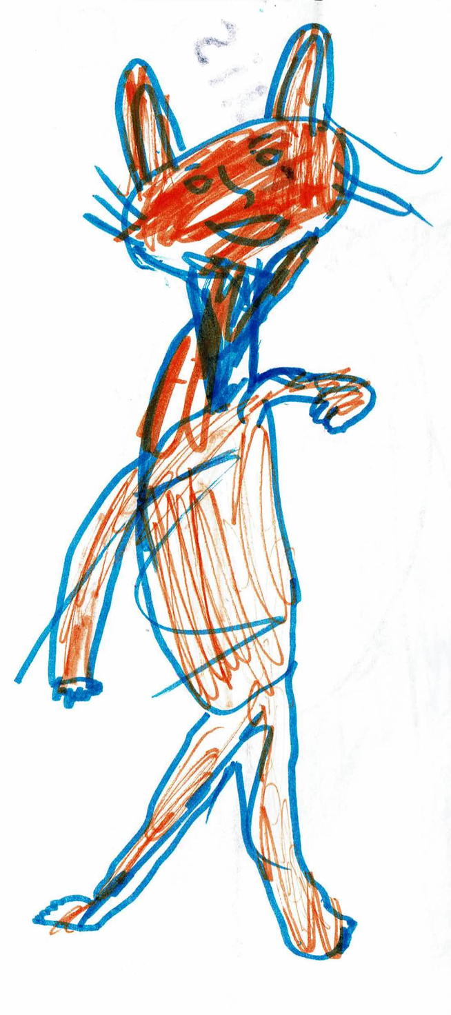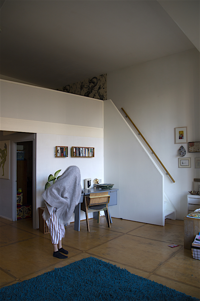 She stands up, runs and flies. When the running and flying are exhausted, she lands on the blue carpet. ‘Water’ she says in an associative mood. ‘What happens when I touch the water?’ It is not a question that is directed to me since she seems not to expect any answer from me. The question is directed towards herself. ‘I become a fish’, she answers. Immediately she starts to moves in a fishy way. The blanket is part of her transformation. Lisa wraps it around her, as a second skin, and soon the blanket and her body transform together in scales, fins and the tail of a fish. The blue carpet is the water: as long as Lisa is in the water, she is a fish. Lisa swims and dives around, and before she knows it, she accidently rolls off the carpet on the wooden floor. ‘The earth’, she says. ‘What happens when I touch the earth?’ ‘I become a mole’, she answers. Voilà, her body transforms into a mole. She crawls around, blindly, and hits a small wooden table. ‘What happens when I touch wood?’ ‘I become a beaver’, she answers