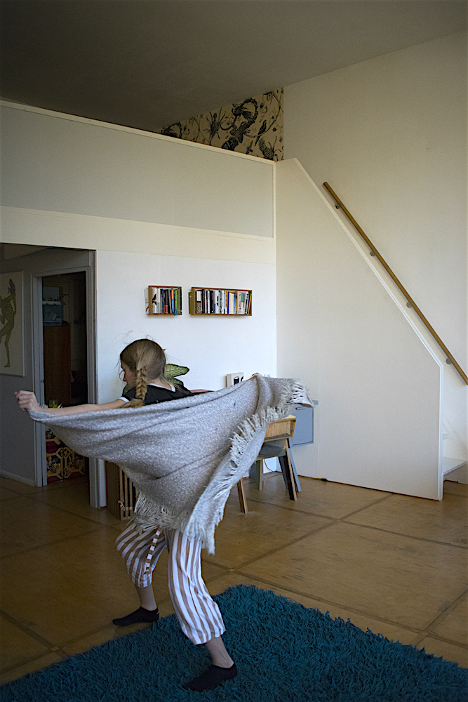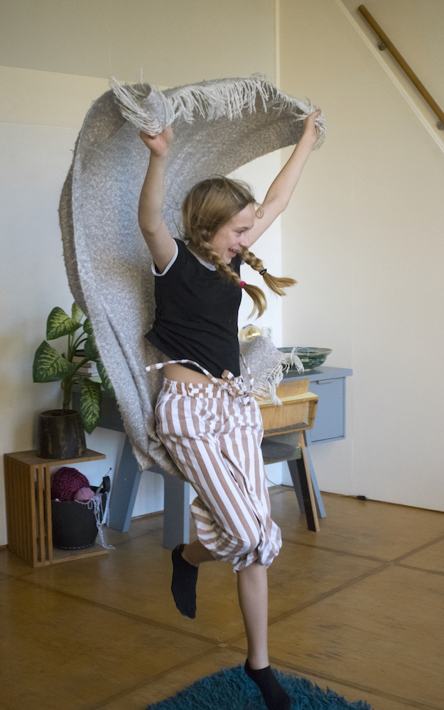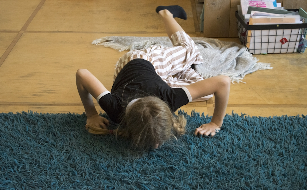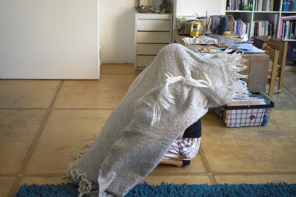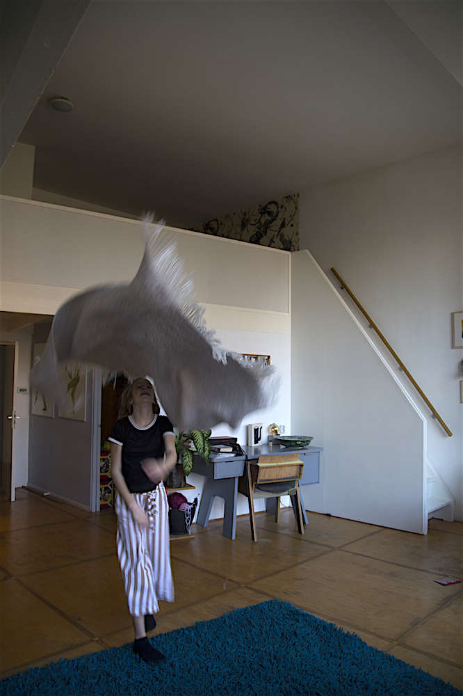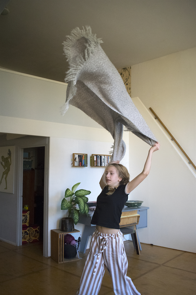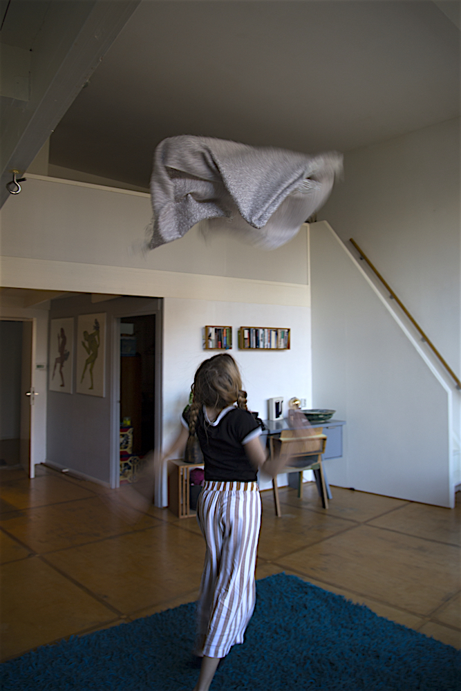 On a Sunday morning Lisa is lying on the big blue carpet in our living room. Just lying. Out of the stillness Lisa spontaneously starts to move. First she does some rolls, then some stretching and along the way Lisa finds a soft blanket that becomes part of her play. ‘I am a bird’ she says, ‘And birds can do whatever they want’.