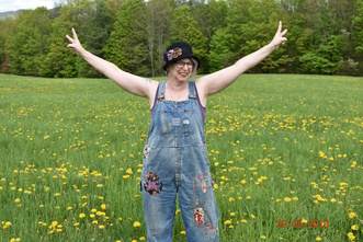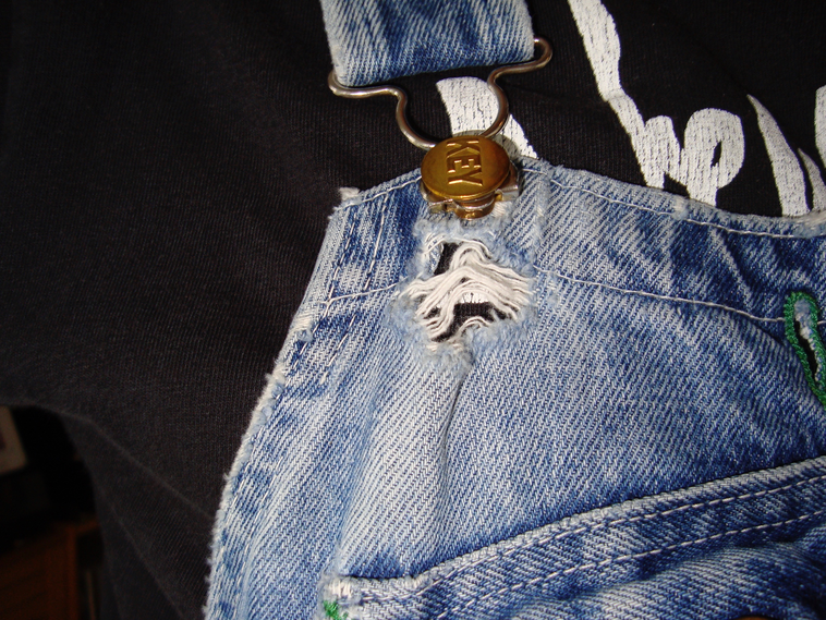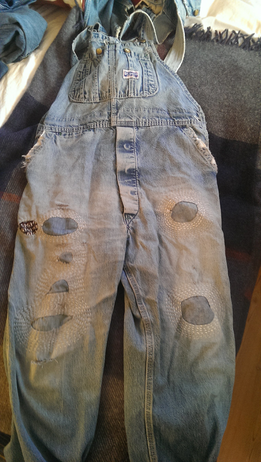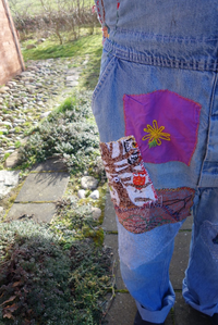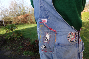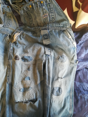 When does a pair of overalls turn into wearable art? It might happen when you start to consider the overalls as a whole as a canvas for the artist. Then the mending process becomes an artistic process and it can start to evolve into not only visible mending but also a "decoration" or a "painting" or simply overalls art