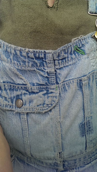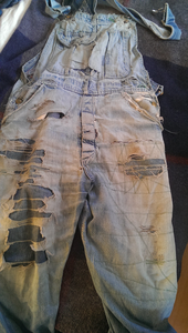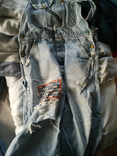 In this section I explore how the overalls are ageing and change their color and fiber structure. They start with dark blue denim and then the get lighter and lighter, and the fibers become thinner and thinner and at one point holes are created and a need of mending emerges.