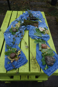 Another project I share with Evelyn is the Wild Overalls. She has brought a pair out into the woods to stay there for around a year through winter, Spring and Summer to bring them close to nature. I buried a pair for 3 months in my small forest and left them for worms and other creatures in the soil together with rusty things and digged them up and now mending and stitching them, and perhaps we will challenge them in other ways in the future in the nature around our two places on Earth.