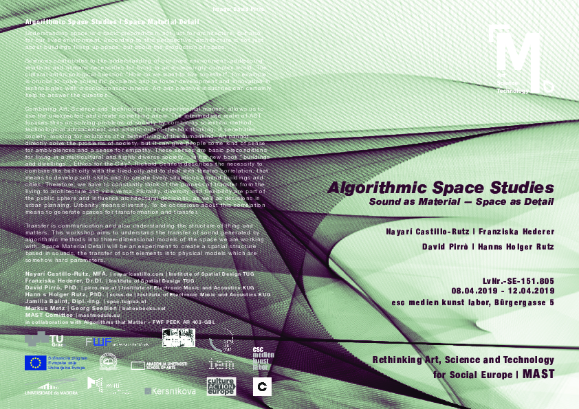 The iterative nature of algorithms, their provisions of repetition and the possibility to rerun them, lead to a straight concept of algorithmic space, as the breadth and organisation of all the forms they are able to produce. However, we assume that algorithmic space is not primarily the result of form generation but of an intrinsic speculative movement of the algorithmic and its interaction with humans who write code and experiment with it. Therefore, making visible and audible the exchange processes between humans and machines becomes a means of critically articulating this space. Data and algorithms are not only operating machines, but they increasingly influence our thoughts and actions, and consequently art and science. The departure point for the course Space Material Detail are algorithmic elements, created within the context of the project Algorithms that Matter that provides an open source for inspiration, exploration and manipulation. Some elements of software, sound and graphics can be translated into models to the (physical) three-dimensional space in order to create an installative experience of space(s).
