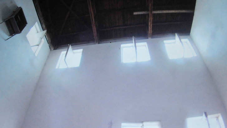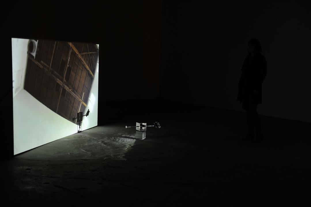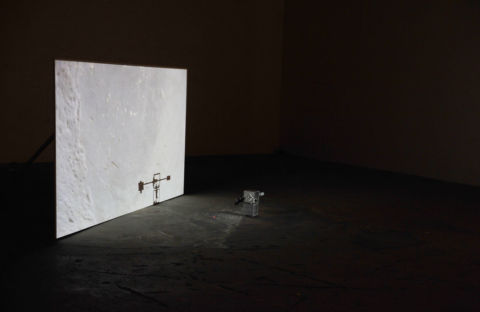 To aid the connection of site and film, the original filming rig is used to make reference to the architectural site via a moving projector, attached where the camera had once been. This makes the viewer equally aware of both the filmic space and the physical space in which they are standing. The pre-recorded image and sound of the gallery is physically mapped in synchronised time with the site, the viewer’s position within the space is entirely mediated by the machine.