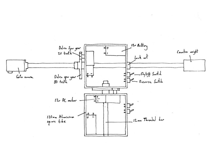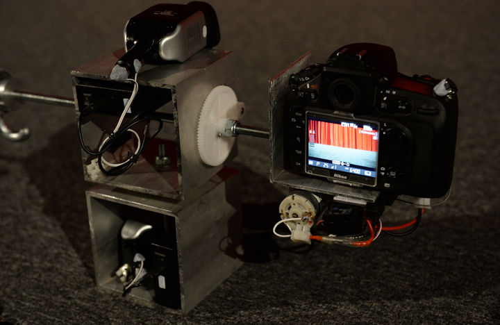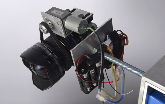 Remote controlled focus for the camera — to enable the camera on the 360-degree rig to change focus, from 10cm when pointing at the ground, to infinity when pointing at the ceiling, a remote controlled focus device was attached using a small worm gear motor and a timing belt.
