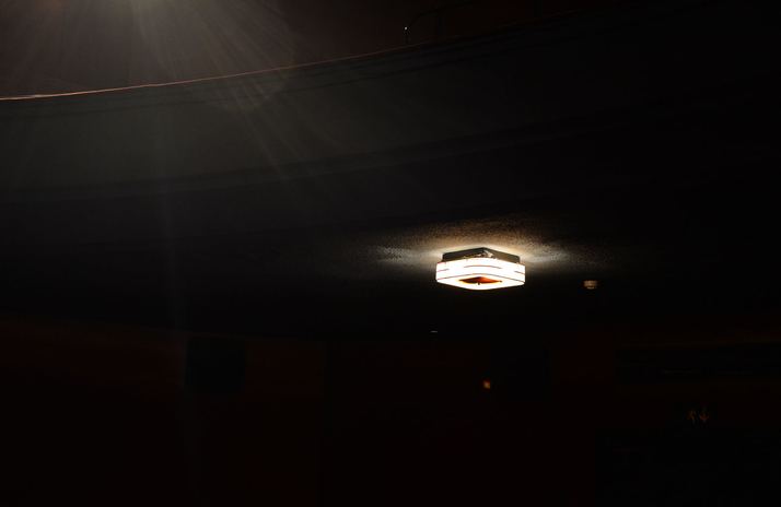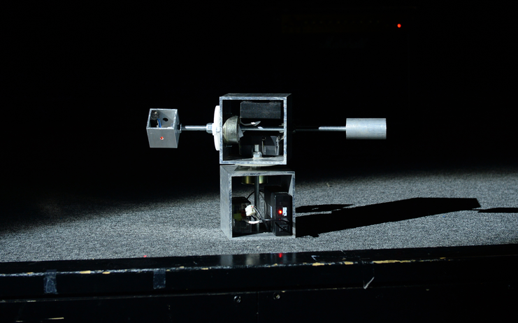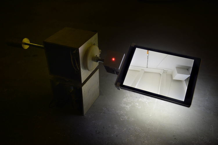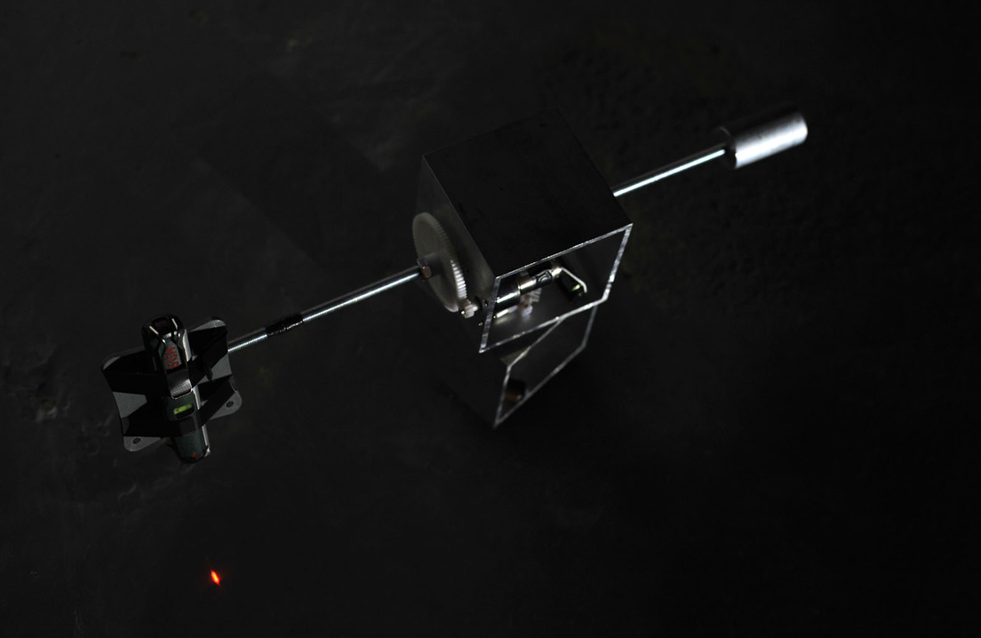 A single laser is attached to where the camera once filmed, as the rig turns the laser travels through the space, projecting a beam of light around the space, from ceiling to floor. The laser invites the audience to follow it in the darkness.