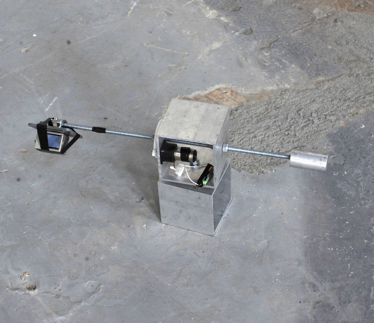 A variety of different rigs are made that explore this notion of the image/tracking device. In this rig a monitor is installed where the camera was once mounted and then a laser is fixed to the opposite end, as the rig turns 360 degrees, the laser tracks in physical space the image on the screen. This has potential, but in a large site it is difficult to locate yourself in relation on the small screen.