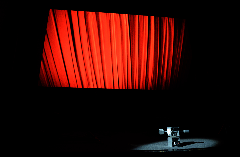 The projected image has two roles: one to locate (anchor the audience within the cinema space) and the other to disorientate (see the cinema space in a new way). Thus, physical space, typically a motionless entity that one can passively inhabit, is transformed into ‘activated’ live space. The primary experience of watching and the secondary experience of representing are merged. The audience becomes aware of their position within the room and within the filmic space depicted in the projection, through a machine that records the space in the past and acts in the present. The device is a major part of the site-specific construct; rather than being merely an invisible tool, its performance is the main subject of the artwork.