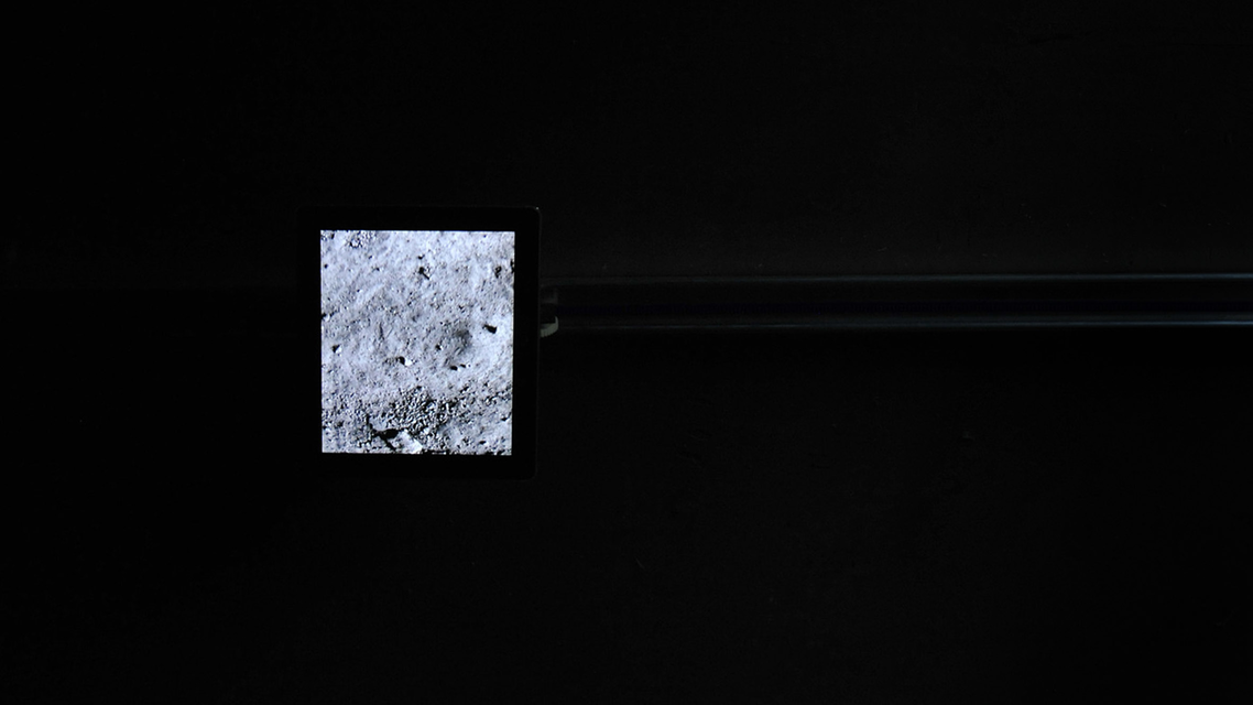 Winspit explores the physical terrain of an old quarry in Dorset, a site regularly used as a background for feature films. An iPad mounted on a motorised track spans the length of the quarry floor recording the detail of the terrain, scanning the site, like a forensic instrument. The iPad slightly magnifies the actual site underneath; this in turn creates a physical effect for the viewer, as the screen appears to ‘open up’ the ground below. The noise of the motorised rig and the illuminated screen guides the viewer deep into the site. The audience experiences an activation of site, a curious interaction/dialogue between technology and nature, a scientific investigation. Winspit fundamentally questions the relationship between image and so-called real space while attempting to present moving image in dialogue with natural form.