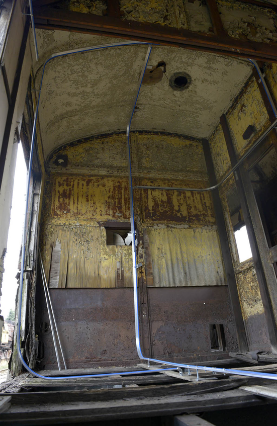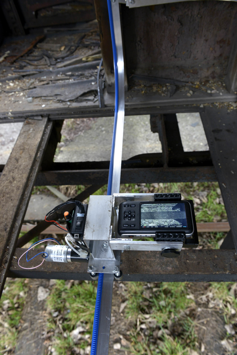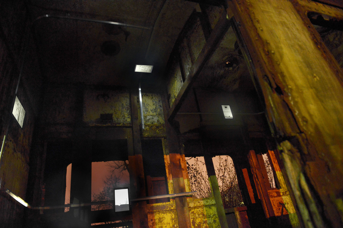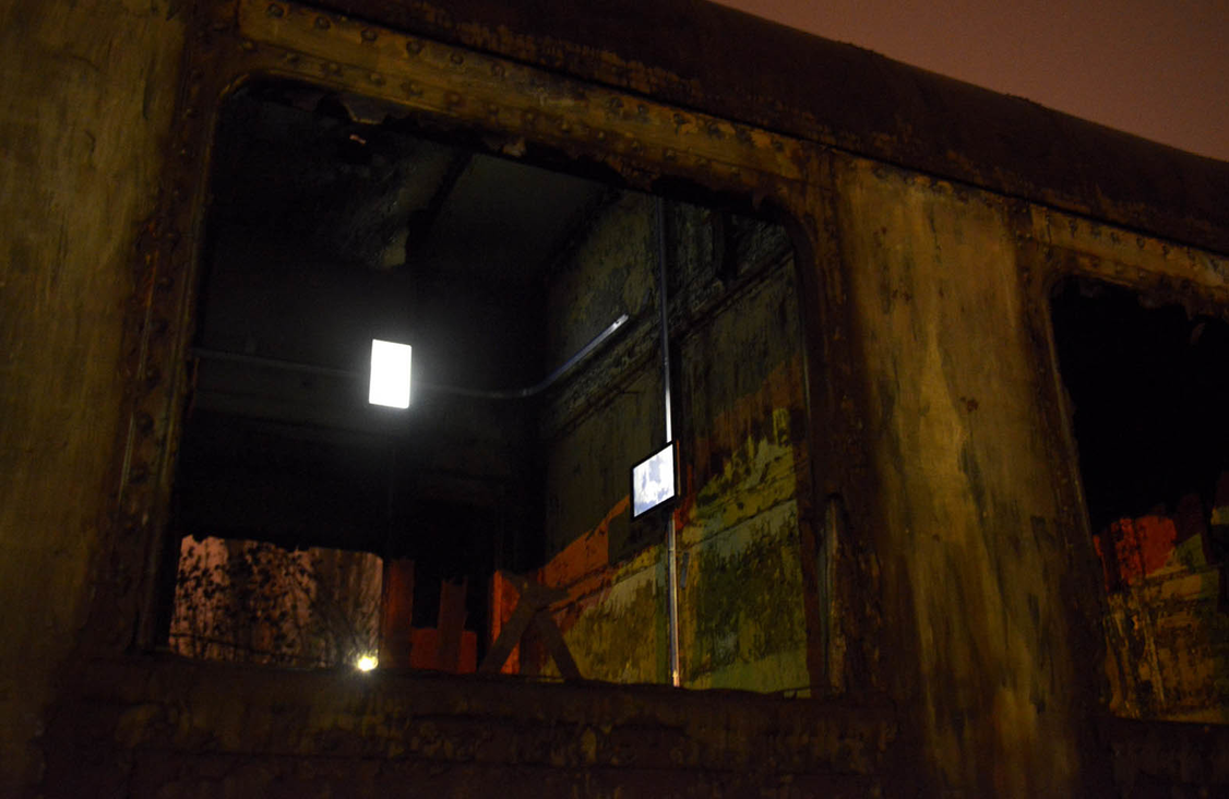 Motorised tracks are built inside one of the abandoned carriages, allowing the materiality of the site to define the structure of the recording device. The captured footage is then played back on eight iPads that move around the space mapping the carriage interior and re-tracing the exact path of the camera, spatially and temporally. As the iPads drift slowly across the surfaces of the abandoned railway carriage, the exact representation in scale is seen on the screens, highlighting the architectural site below.