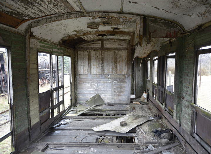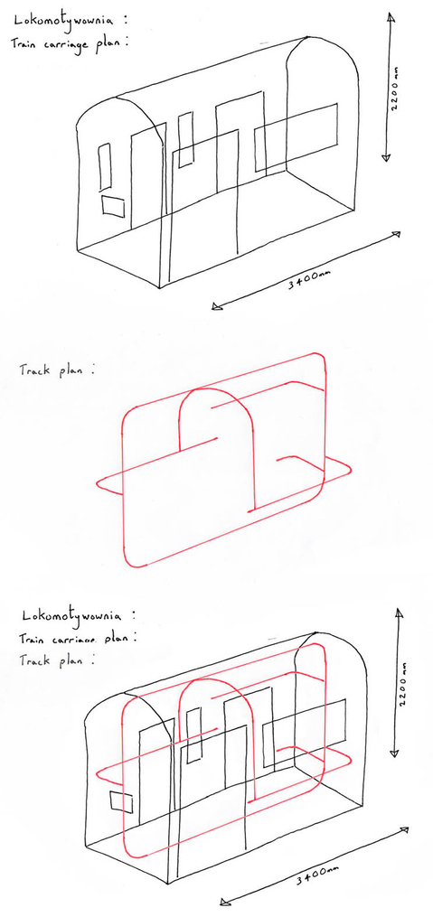 Lokomotywownia attempts to present moving image in dialogue with sculptural form as tracks are built in the shell of the carriage – the viewer experiences the materiality of the train carriage from the inside out, as the reading of detail builds the comprehension of architectural space.