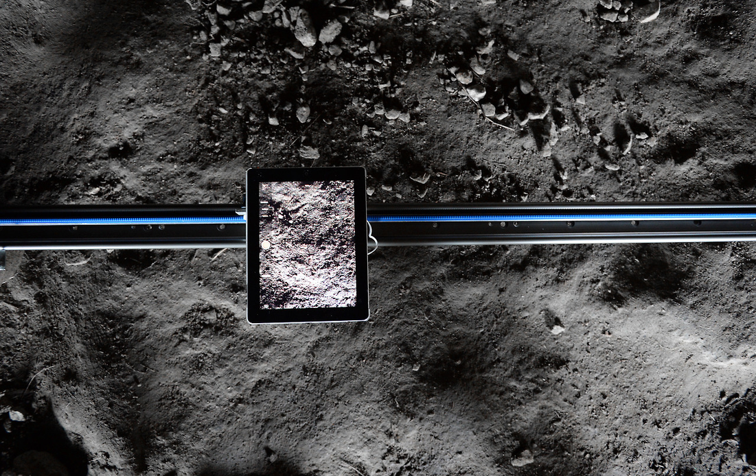 The nature of the iPad slightly magnifies the actual site underneath; this in turn creates a physical effect for the viewer, as the iPad screen appears to ‘open up’ the ground below. Similar to Victor Burgin’s Photopath (1967–9), where photographs of the floor (on which the work is installed) are enlarged to exactly match the scale of the floor itself. The iPad also records the ambient sounds of the quarry, battling with the mechanical sound of the motorised track.