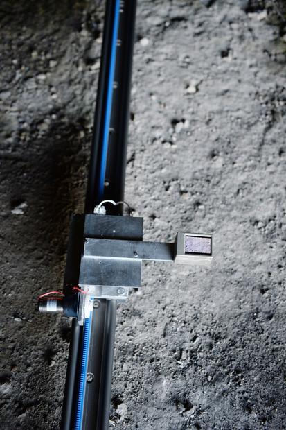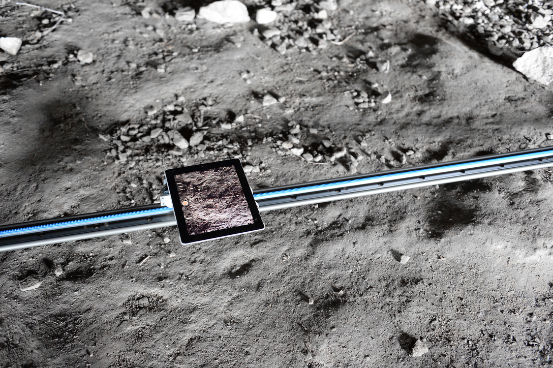 The nature of the iPad slightly magnifies the actual site underneath; this in turn creates a physical effect for the viewer, as the iPad screen appears to ‘open up’ the ground below. Similar to Victor Burgin’s Photopath (1967–9), where photographs of the floor (on which the work is installed) are enlarged to exactly match the scale of the floor itself. The iPad also records the ambient sounds of the quarry, battling with the mechanical sound of the motorised track.