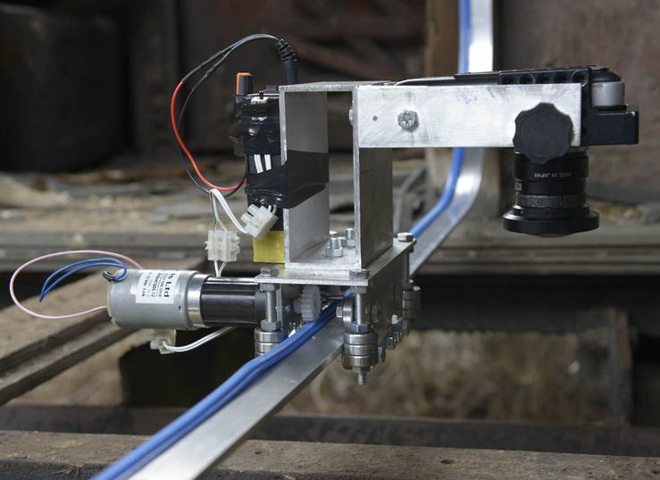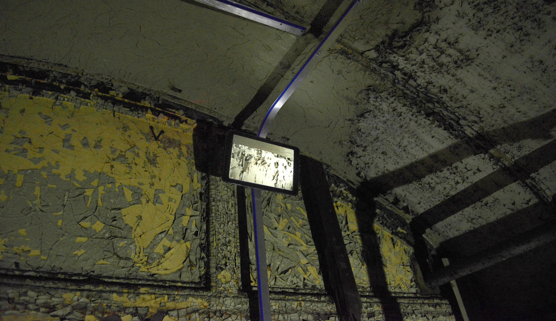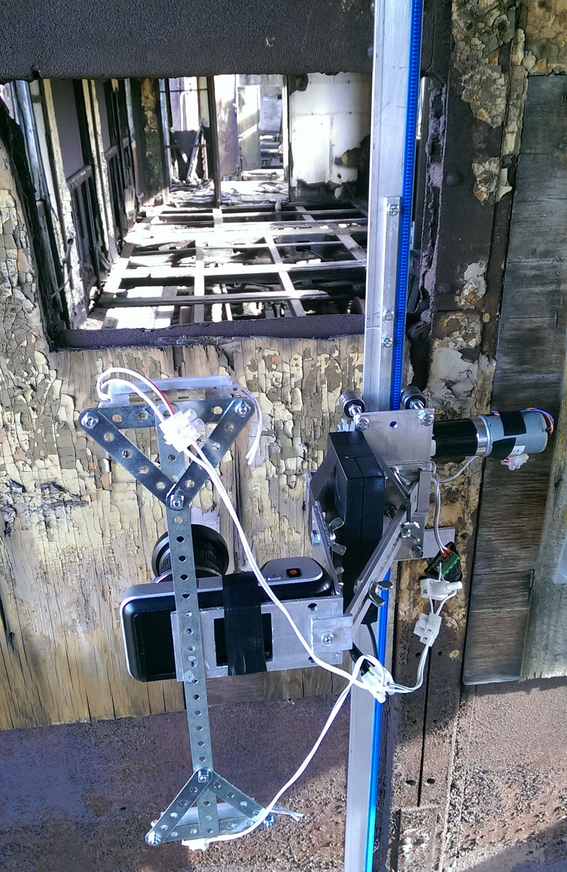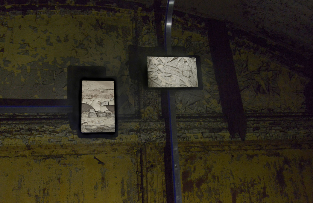 Motorised tracks are built inside one of the abandoned carriages, allowing the materiality of the site to define the structure of the recording device. The captured footage is then played back on eight iPads that move around the space mapping the carriage interior and re-tracing the exact path of the camera, spatially and temporally. As the iPads drift slowly across the surfaces of the abandoned railway carriage, the exact representation in scale is seen on the screens, highlighting the architectural site below.
