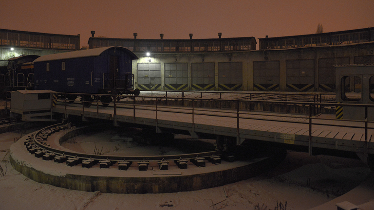Lokomotywownia attempts to present moving image in dialogue with sculptural form as tracks are built in the shell of the carriage – the viewer experiences the materiality of the train carriage from the inside out, as the reading of detail builds the comprehension of architectural space.